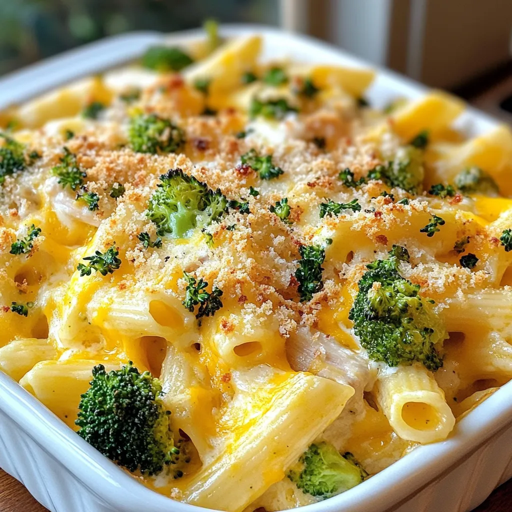 A comforting and cheesy pasta bake loaded with chicken, broccoli, and two types of cheese.
