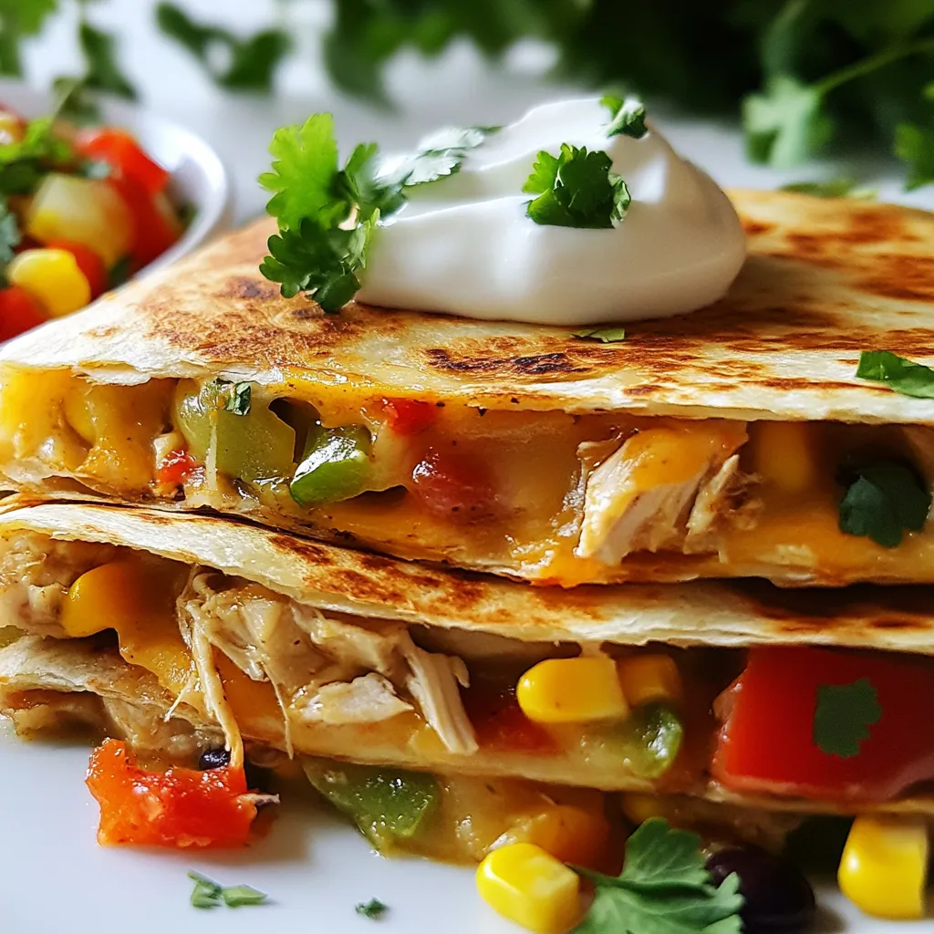 - 2 cups cooked chicken, shredded - 1 cup bell peppers (mix of red and green), sliced - 1 cup corn (fresh or frozen) - 1 cup black beans, rinsed and drained - 1 ½ cups shredded cheddar cheese - 1 teaspoon chili powder - 1 teaspoon cumin - ½ teaspoon garlic powder - ½ teaspoon onion powder - 4 large flour tortillas - 2 tablespoons olive oil - Sour cream and salsa for serving In this recipe, I use simple yet tasty ingredients. Shredded chicken brings protein. Bell peppers add color and crunch. Corn and black beans provide sweetness and texture. The cheddar cheese melts perfectly and ties it all together. The spices do more than add flavor. They excite the taste buds! Chili powder and cumin give warmth. Garlic and onion powder bring depth. This blend of spices makes the quesadilla pop! I choose large flour tortillas for their softness and flexibility. They hold the filling well and crisp up nicely. Olive oil helps achieve that golden brown crust. Finally, sour cream and salsa are perfect for dipping. They add creaminess and tang to every bite. {{ingredient_image_1}} To start, we need to combine the main ingredients. In a large bowl, add: - 2 cups cooked chicken, shredded - 1 cup bell peppers, sliced (mix of red and green) - 1 cup corn (fresh or frozen) - 1 cup black beans, rinsed and drained Next, we mix in the spices. For flavor, add: - 1 teaspoon chili powder - 1 teaspoon cumin - ½ teaspoon garlic powder - ½ teaspoon onion powder Stir everything well. You want the chicken and veggies coated in the spices. This will give your quesadillas a great taste. Now, it’s time to heat the skillet. Pour 1 tablespoon of olive oil into a large skillet over medium heat. Place one tortilla in the skillet. On half of the tortilla, layer: - ½ cup shredded cheddar cheese Then, spoon a generous amount of the chicken mixture over the cheese. Finally, sprinkle another ½ cup of cheese on top. Fold the tortilla in half. Cook for about 3-4 minutes. You want the bottom to turn golden brown and the cheese to start melting. Carefully flip the quesadilla using a spatula. Add the remaining tablespoon of olive oil around the edges of the skillet. Cook for another 3-4 minutes until the other side is golden brown and crispy. Once cooked, remove the quesadilla from the skillet. Slice it into wedges and keep warm. Repeat this process with the remaining tortillas and filling. Serve the quesadillas warm. I like to add sour cream and salsa on the side for dipping. This adds a nice touch to your meal. Enjoy! To make the best quesadilla, focus on even cooking. Start with a medium heat to avoid burning. Using a cast-iron skillet works well, as it holds heat evenly. Check the color of the tortilla; it should be golden brown. This means it is cooked just right. For cheese melting tips, use freshly shredded cheese. Pre-shredded cheese often contains anti-caking agents. These can affect how well the cheese melts. Add cheese to both sides of the filling. This makes the quesadilla extra gooey and delicious. If you want to switch proteins, try using cooked turkey or pork. For a vegetarian option, consider black beans or chickpeas. Both add protein and flavor. Seasonal veggies can elevate your quesadilla. In spring, use fresh asparagus or zucchini. In summer, add ripe tomatoes or corn. Autumn is great for sweet potatoes, while winter calls for hearty greens. For serving styles, consider cutting your quesadilla into wedges. This makes it easier to share. You can stack the wedges on a plate for a colorful look. Garnishing adds visual appeal. Try adding fresh cilantro or a sprinkle of lime juice. A dollop of sour cream and a side of salsa make it fun to dip. These small touches make your meal look gourmet. Pro Tips Use Fresh Ingredients: For the best flavor, use fresh bell peppers and corn when available. Fresh ingredients enhance the overall taste of your quesadillas. Don’t Overfill: Be careful not to overfill your quesadilla. A little filling goes a long way, and it helps to avoid messy spills when cooking and flipping. Customize Your Cheese: While cheddar is great, feel free to mix different cheeses like Monterey Jack or pepper jack for added flavor and creaminess. Keep Them Warm: After cooking each quesadilla, place them on a plate covered with a kitchen towel or in a warm oven to keep them warm while you finish the rest. {{image_2}} You can easily swap chicken for veggies in your quesadilla. Try using a mix of sautéed mushrooms, zucchini, and spinach. These add great flavor and texture. You can add different types of cheese too. Mozzarella or pepper jack work well here. They melt nicely and enhance the taste. If you like heat, consider making spicy chicken quesadillas. Adding jalapeños brings a nice kick to the filling. You can also use spicy cheese, like pepper jack, for more heat. A splash of hot sauce can amp up the flavor too. Just a little will make your taste buds dance! Breakfast quesadillas are a fun twist on the classic. Start by adding scrambled eggs and your favorite breakfast meats, like bacon or sausage. You can mix in breakfast-style spices too, like paprika or a pinch of cayenne. Add some diced bell peppers for color and flavor. They make a tasty start to your day! To store your leftover quesadillas, first let them cool to room temperature. This step helps prevent sogginess. Next, place them in an airtight container. Glass or plastic containers work well. You can also wrap them tightly in plastic wrap or foil. Label the container with the date. This way, you know when to eat them. When it comes to reheating, you have two main options: the oven or the microwave. For the oven, preheat it to 350°F (175°C). Place the quesadillas on a baking sheet. Heat them for about 10-15 minutes. This keeps them crispy. If you use the microwave, place a quesadilla on a plate. Heat it for 1-2 minutes. You may lose some crispiness, so add a paper towel to keep it moist. To freeze quesadillas, make sure they cool completely fi