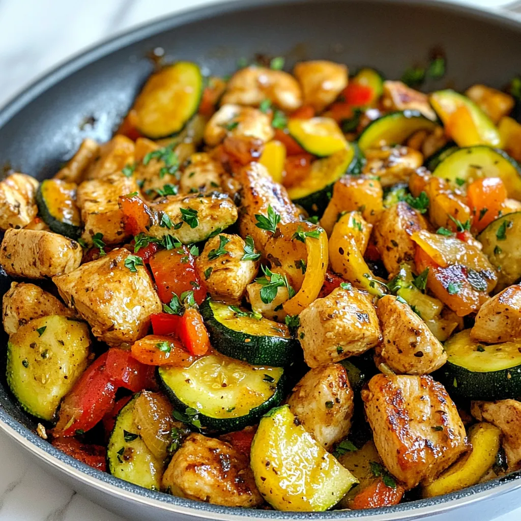 Add Vegetables: Once the chicken is cooked, add the sliced zucchinis and diced red bell pepper to the skillet. Stir gently to combine.