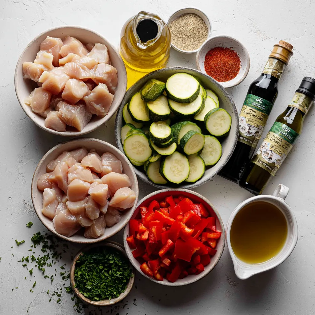 You will need two boneless and skinless chicken breasts. These should be cut into cubes. Grab two medium zucchinis; slicing them into half-moons gives a nice shape. A single red bell pepper diced adds color and taste. For flavor, you will use garlic powder, onion powder, and paprika. These spices bring a warm taste. You can season with salt and pepper as you like.