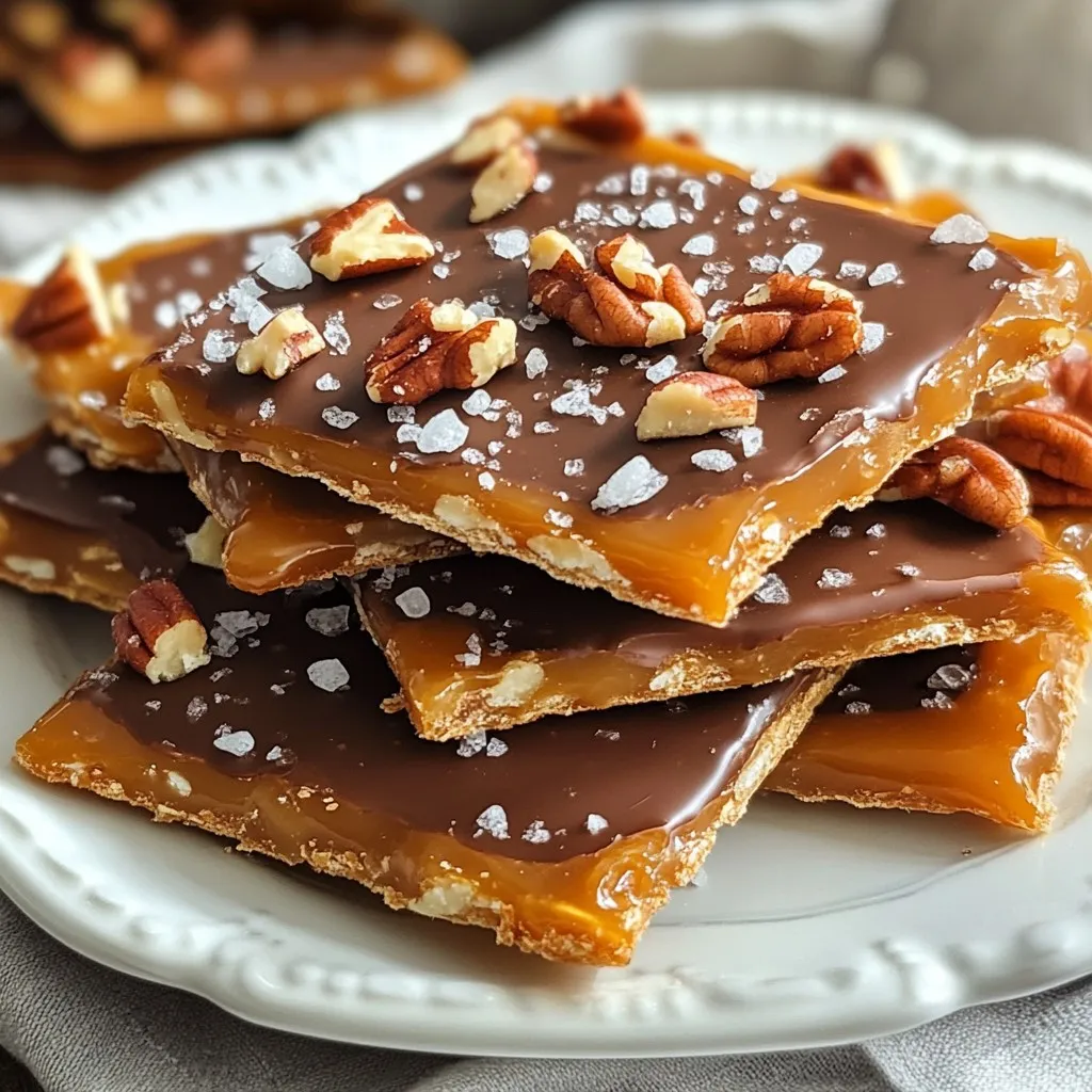 - 1 cup unsalted butter - 1 cup packed brown sugar - 1 teaspoon vanilla extract - 1/4 teaspoon salt - 1 package (about 40) saltine crackers - 1 cup semi-sweet chocolate chips - 1/2 cup chopped pecans or walnuts (optional) - Sea salt for sprinkling Each ingredient plays a key role in making this treat shine. The unsalted butter gives a rich base. The brown sugar adds sweetness and a lovely caramel flavor. Vanilla extract brings warmth and depth. The salt balances the sweetness, making each bite better. Saltine crackers act as the crunchy base. They soak up the toffee while keeping their crispness. The chocolate chips melt into a smooth, sweet layer on top. If you want a nutty crunch, add chopped pecans or walnuts. Finally, a sprinkle of sea salt at the end enhances the sweet-salty mix. Gather all these ingredients before starting. This prep helps you move quickly and make the process fun. Enjoy the joy of creating something sweet and share it with your loved ones! {{ingredient_image_1}} Start by preheating your oven to 400°F (200°C). This is the perfect heat for toffee. While the oven warms up, take a baking sheet and line it with parchment paper. Make sure the paper hangs over the edges. This helps with easy removal later. Now, grab your package of saltine crackers. You will need about 40 of them. Lay the crackers in a single layer on the baking sheet. Cover the entire surface. This will form the base of your toffee. In a medium saucepan, add 1 cup of unsalted butter and 1 cup of packed brown sugar. Heat it over medium heat. Stir constantly until it boils. When it starts to bubble, time it for exactly 3 minutes. Do not stir during this time. After 3 minutes, take it off the heat. Stir in 1 teaspoon of vanilla extract and 1/4 teaspoon of salt. Carefully pour this hot toffee mixture over your saltine crackers. Use a spatula to spread it out evenly. Bake it in the oven for 5 to 7 minutes. You want it bubbling and lightly golden. Once done, take it out of the oven and sprinkle 1 cup of semi-sweet chocolate chips on top. Let it sit for about 2 minutes. This will soften the chocolate. After that, spread it out with your spatula. If you want, add 1/2 cup of chopped pecans or walnuts over the melted chocolate. Press them in lightly. Finally, sprinkle some sea salt on top. Let your toffee cool at room temperature for 30 minutes. Then, put it in the fridge for at least 1 hour. Once set, break it into pieces. Enjoy your sweet treat! Toffee should be crunchy but not hard. To get this right, pay close attention to your cooking time. Boil the butter and sugar mix for exactly three minutes. If you boil it for too long, it will harden. If you don’t boil it long enough, it won't set properly. Use a candy thermometer for extra help. Aim for 290°F (143°C) for the perfect texture. It’s worth it for the crunch! Sticking can ruin your toffee experience. To stop this, use parchment paper on your baking sheet. Make sure the paper hangs over the edges. This helps you lift the toffee out easily. When pouring the hot toffee mix, spread it quickly. A spatula works great for this. If it cools too much, it can stick to the crackers. So, work fast! Melting chocolate may seem easy, but it can be tricky. Use semi-sweet chocolate chips for the best taste. When you sprinkle them on the hot toffee, let them sit for two minutes. This softens the chocolate. After that, use a spatula to spread it evenly. If you heat it too much, it can seize up. Keep heat low and be patient for the best results. Pro Tips Use Fresh Ingredients: Always opt for fresh butter and quality chocolate chips for the best flavor. Don’t Overcook the Toffee: Keep an eye on the toffee mixture while boiling. Overcooking can lead to a bitter taste. Let it Cool Completely: Ensure the toffee cools completely at room temperature before refrigerating to achieve the perfect texture. Experiment with Toppings: Feel free to mix in different nuts, sprinkles, or even crushed candies for a fun twist! {{image_2}} You can easily make nut-free Christmas crack toffee. Simply skip the nuts in the recipe. The toffee still tastes amazing without them. If you want a little crunch, try adding crushed pretzels. They give a nice salty bite. This version is perfect for those with nut allergies. Want to add some fun flavors? You can use different extracts. Instead of vanilla, try almond or peppermint. Just swap the vanilla extract for the new flavor. It adds a unique twist to your toffee. You can even mix extracts for a more complex taste. Just remember to keep the amounts the same. Get creative with toppings! Besides nuts, you can add many things. Try crushed candy canes for a festive touch. You can also sprinkle mini marshmallows for a s'mores vibe. For a sweeter taste, use M&M's or caramel bits. Spread them over the chocolate while it’s still warm. This makes a great treat for parties or gifts. To keep your Christmas Crack Toffee fresh, place it in an airtight container. Make sure the pieces are separated to avoid sticking. If you have multiple layers, use parchment paper between them. Store it at room temperature for the best taste. You can freeze Christmas Crack Toffee if you want to save some for later. Cut it into pieces and wrap each piece in plastic wrap. Then, place the wrapped pieces in a freezer-safe bag. When you’re ready to enjoy, just take out what you need and let it thaw at room temperature. Christmas Crack Toffee stays fresh for about two weeks at room temperature. If stored properly in the freezer, it can last up to three months. However, I find that the flavor is best within the first few weeks. Enjoy the sweet, crunchy goodness while it’s at its peak! Christmas Crack Toffee is a sweet treat made with butter, brown sugar, and chocolate. It has a crunchy base from saltine crackers. The mix of sweet and salty flavors makes it hard to resist. You can share it as a gift or snack on it yourself! You can make Christmas Crack Toffee a few days in advanc