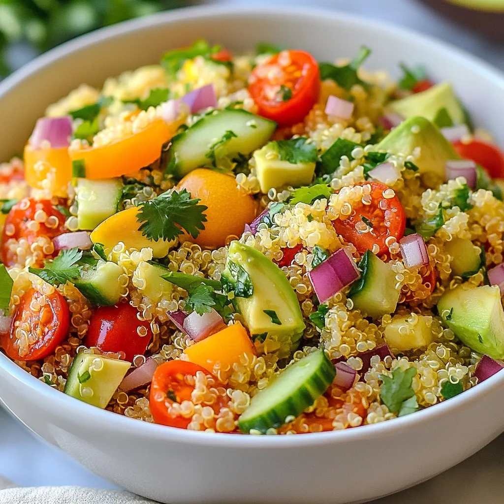To make this bright and tasty cilantro lime quinoa salad, you will need: - 1 cup quinoa, rinsed and drained - 2 cups vegetable broth or water - 1 cup cherry tomatoes, halved - 1 cucumber, diced - 1 red bell pepper, diced - 1 can (15 oz) black beans, rinsed and drained - 1 avocado, diced - 1/2 cup fresh cilantro, chopped - 1/4 cup red onion, finely chopped - Juice of 2 limes - 3 tablespoons olive oil - 1 teaspoon cumin - Salt and pepper to taste If you can’t find some ingredients, don’t worry! Here are some easy swaps: - Instead of quinoa, you can use bulgur or farro. - Swap black beans for chickpeas or kidney beans. - Use lime juice from a bottle if fresh limes are not available. - For a creamier taste, you can replace avocado with Greek yogurt. - If you don’t have fresh cilantro, parsley makes a good alternative. This salad is not only tasty but also good for you! Each serving has: - Calories: 300 - Protein: 10g - Carbohydrates: 45g - Fat: 12g - Fiber: 12g - Sugars: 2g With these ingredients, you're set for a fresh and healthy meal! Each bite offers a mix of flavors and good nutrition. {{ingredient_image_1}} To start, bring 2 cups of vegetable broth or water to a boil in a medium saucepan. This adds taste and nutrients. Once it boils, add 1 cup of rinsed quinoa. Reduce heat to low and cover the pot. Let it simmer for about 15 minutes. The quinoa will absorb all the liquid and become fluffy. After 15 minutes, take it off the heat. Let it cool for about 10 minutes. Fluff it gently with a fork to separate the grains. While the quinoa cools, grab a large mixing bowl. In this bowl, add the cooled quinoa. Then, toss in 1 cup of halved cherry tomatoes, 1 diced cucumber, and 1 diced red bell pepper. Next, add 1 can of black beans that you’ve rinsed and drained. Don’t forget to include 1 diced avocado, 1/2 cup of chopped fresh cilantro, and 1/4 cup of finely chopped red onion. Mix gently to combine all the fresh, vibrant ingredients. Now, let’s make the dressing. In a small bowl, squeeze the juice of 2 limes. Add 3 tablespoons of olive oil, 1 teaspoon of cumin, and a pinch of salt and pepper. Whisk it all together until it blends well. This dressing will add a zesty kick to your salad. Drizzle the dressing over the quinoa mixture and toss gently. Make sure every ingredient is coated. Taste the salad and adjust the seasoning. You can add more lime juice, salt, or pepper if you wish. To cook fluffy quinoa, start by rinsing one cup of quinoa in water. This step removes any bitter taste. Next, bring two cups of vegetable broth or water to a boil in a medium saucepan. Once boiling, add the rinsed quinoa. Reduce the heat to low, cover, and let it simmer for about 15 minutes. After the time is up, remove the pot from the heat. Let it sit for 10 minutes to steam. Finally, fluff the quinoa with a fork. This method gives you perfectly cooked quinoa every time. To boost the flavor of your quinoa salad, use fresh ingredients. Always opt for ripe cherry tomatoes and a bright cucumber. Add fresh lime juice and good olive oil for a zesty kick. A teaspoon of cumin brings warmth and depth to the dish. Don’t forget to season with salt and pepper to taste. Mixing in fresh herbs like cilantro adds a vibrant touch. Adjust the lime juice as needed to suit your taste. This makes every bite more enjoyable. For a stunning presentation, use a large bowl to serve your salad. Layer the ingredients for a colorful look. Garnish the top with extra cilantro and lime wedges. This not only looks good but also adds more flavor. You can also serve individual portions for a nice touch at a gathering. A sprinkle of additional cumin on top gives a hint of spice. These small details make your salad appealing and fun to eat. Pro Tips Rinse the Quinoa: Rinsing quinoa before cooking removes its natural coating, called saponin, which can taste bitter. This step ensures a more pleasant flavor in your salad. Choose Fresh Ingredients: For the best flavor and nutrition, opt for fresh vegetables and herbs. Look for vibrant colors and firm textures when selecting your produce. Customize the Dressing: Feel free to adjust the lime juice and olive oil to suit your taste. Adding a pinch of sugar or a dash of hot sauce can create a unique flavor profile. Make it Ahead: This salad keeps well in the refrigerator, making it a great option for meal prep. Just add the avocado right before serving to prevent browning. {{image_2}} You can easily boost the protein in your cilantro lime quinoa salad. Try adding grilled chicken, shrimp, or tofu. Each of these choices adds unique taste and texture. For a simple boost, mix in some nuts or seeds. Pumpkin seeds or slivered almonds work great. They add crunch and nutrition. This salad is already vegan and gluten-free, but you can make it even more so. If you want a different flavor, swap the black beans for chickpeas. They give a nice twist and keep it hearty. Also, check your vegetable broth. Ensure it is gluten-free if you need that option. Using seasonal vegetables makes this salad fresh and exciting. In spring, add asparagus or snap peas for crunch. Summer is perfect for ripe peaches or corn. In fall, roasted sweet potatoes add warmth. Winter calls for hearty veggies like brussels sprouts. These changes keep your salad vibrant and satisfying. To keep your cilantro lime quinoa salad fresh, store it in an airtight container. Make sure the salad is cool before sealing it. This way, you limit moisture and keep flavors intact. Place the container in the fridge. It stays fresh for about 3 to 5 days. If you notice any changes in smell or color, it's best to toss it. You can freeze cilantro lime quinoa salad, but avoid freezing the fresh avocado and tomatoes. These ingredients don't thaw well. To freeze, portion the salad into freezer-safe bags or containers. Remove as much air as possible before sealing. It can last up to 2 months in the freezer. When ready to eat, thaw it in the fridge overnight. Cilan