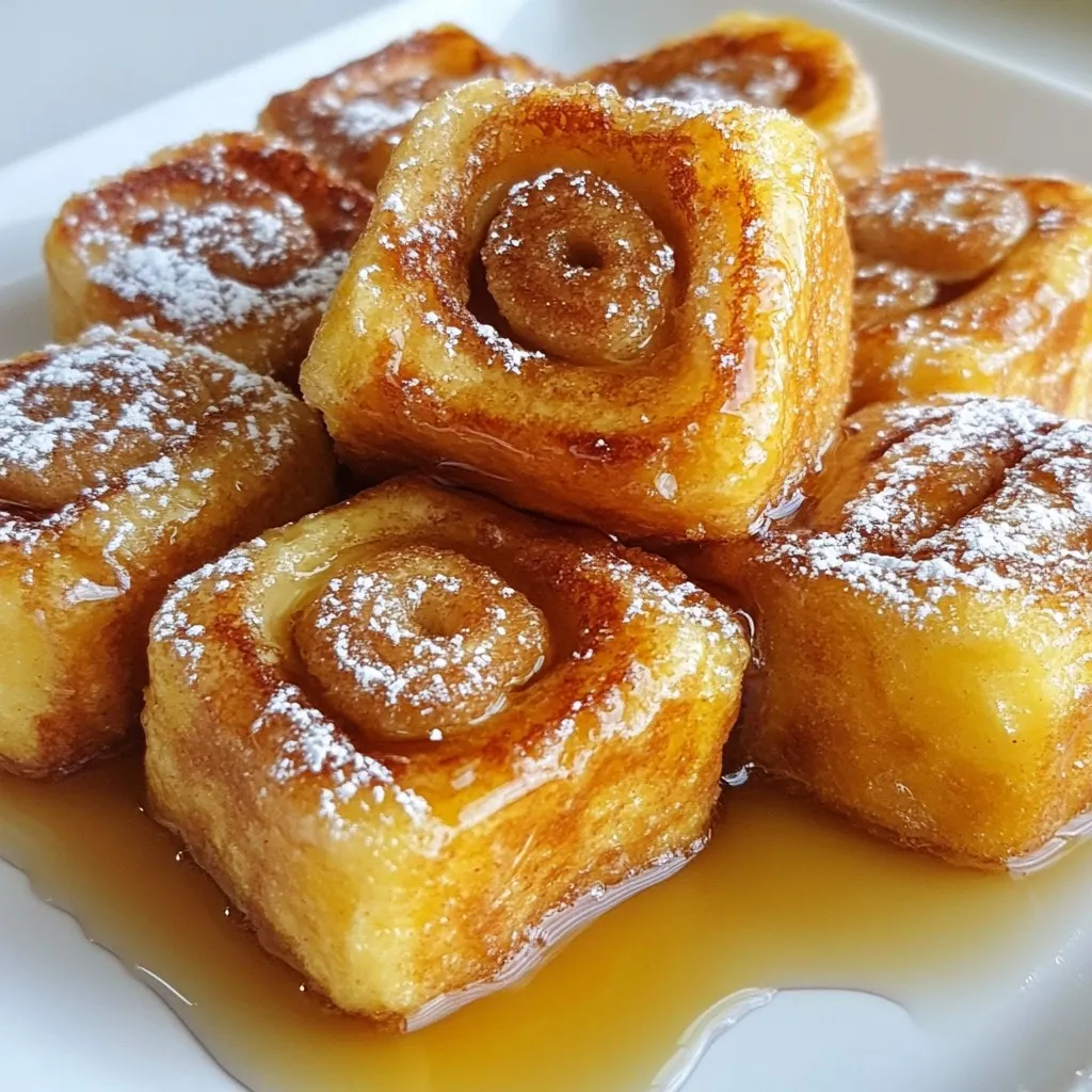 Delicious bites of cinnamon rolls transformed into a French toast treat, perfect for breakfast or brunch.