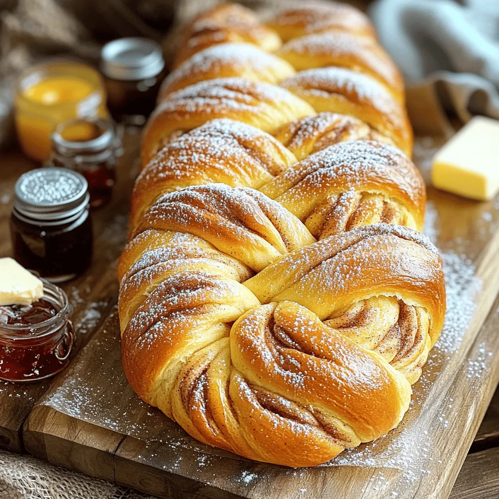 Next, cut the log in half lengthwise to show the layers. Twist the two pieces around each other. Then shape it into a coil or braid. Place it in a greased loaf pan. Cover it with a towel again and let it rise for another thirty to forty-five minutes, until it puffs up. While this happens, preheat your oven to 350°F (175°C). Beat the last egg and brush it over the dough for shine. Bake for thirty to thirty-five minutes. The top should be golden brown. A toothpick should come out clean when you check it in the center. After baking, let it cool in the pan for ten minutes before moving it to a wire rack.