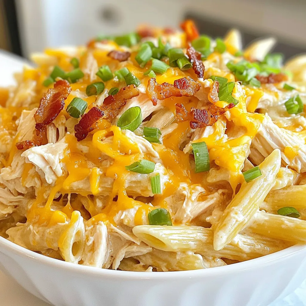 Each ingredient plays a key role in the dish. The penne pasta serves as a perfect base. The chicken breasts bring protein and heartiness. Olive oil helps to cook the chicken, while ranch seasoning adds that special flavor. Cream cheese makes the sauce rich and creamy. Chicken broth enhances the sauce, while cheddar cheese adds extra flavor and creaminess. Green onions give a fresh touch, and bacon adds a delightful crunch. Don’t forget salt and pepper to make everything taste just right.