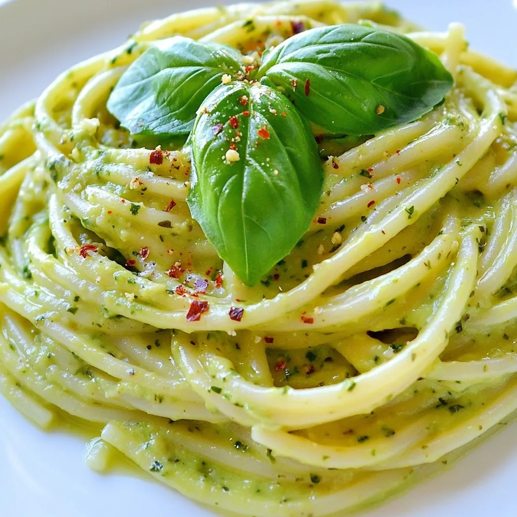 - 2 ripe avocados - 2 cloves garlic, minced - 2 tablespoons fresh lemon juice - 1 tablespoon olive oil - 1/4 cup fresh basil leaves, plus extra for garnish - 1/2 teaspoon red pepper flakes (optional) - Salt and pepper to taste - 8 oz spaghetti or your choice of pasta - 1/4 cup grated Parmesan cheese (optional) When I make creamy avocado pasta, I love using ripe avocados. They bring a rich, buttery taste. The garlic adds a nice kick, balancing the creaminess. Fresh lemon juice brightens the dish with a zesty note. Olive oil gives the sauce a smooth texture and a hint of earthiness. I always add fresh basil leaves for a pop of flavor. If you like heat, red pepper flakes work well. Salt and pepper help bring out all the tastes. For the pasta, I prefer spaghetti, but any type you like will do. If you want extra creaminess, grated Parmesan cheese is a great choice. It adds depth and richness. This ingredient list is simple, but each one plays an important role. Together, they create a fresh and vibrant dish that you can enjoy any day of the week. {{ingredient_image_1}} To start, boil a large pot of salted water. Add your pasta to the boiling water. Cook the pasta until it is al dente. This usually takes about 8-10 minutes. Once cooked, reserve one cup of the pasta water. Drain the rest and set the pasta aside. Next, grab a food processor. Combine the ripe avocados, minced garlic, lemon juice, olive oil, and fresh basil in it. If you like a bit of spice, add red pepper flakes. Blend everything until it is smooth and creamy. If the sauce is too thick, splash in some reserved pasta water to reach your desired creaminess. In a large bowl, mix the cooked pasta with the avocado sauce. Toss it well to coat the pasta evenly. If the sauce remains thick, add more reserved pasta water a little at a time. This will help you get the right texture. Now it’s time to taste the dish. Add salt, pepper, and a bit more lemon juice if you want. If you love cheese, mix in grated Parmesan for extra creaminess. Serve the creamy avocado pasta in bowls. Garnish with fresh basil and a sprinkle of red pepper flakes to make it pop. Enjoy your flavorful dish! To check for ripeness, gently squeeze the avocado. It should feel slightly soft but not mushy. Look for a dark color, but keep in mind that some varieties stay green. If your avocados are not ripe, place them in a paper bag with a banana. This can speed up the ripening process. For perfect sauce consistency, blend your avocado mixture until smooth. If it’s too thick, add a splash of reserved pasta water. You can also mix in other flavors like lemon zest or fresh herbs. This adds extra brightness and depth. Creamy avocado pasta pairs well with a fresh salad or grilled veggies. Try serving it with a simple arugula salad dressed in lemon and olive oil. Crusty bread goes great too. Add some cheese on top for an extra touch. Pro Tips Use Ripe Avocados: Make sure your avocados are perfectly ripe for the creamiest sauce. A ripe avocado will yield slightly to pressure and have a deep green color. Customize the Pasta: Feel free to swap out the spaghetti for whole wheat, gluten-free, or even zoodles for a healthier alternative. Adjust the Creaminess: Depending on your preference, you can add more reserved pasta water slowly until you reach your desired sauce thickness. Garnish for Flavor: Enhance the presentation and flavor by garnishing with extra basil and a sprinkle of red pepper flakes or even toasted nuts for added crunch. {{image_2}} You can add protein to your creamy avocado pasta for extra flavor and nutrition. - Grilled chicken or shrimp: These proteins work well. They add a nice texture and taste. Just grill them, slice, and mix into the pasta. - Vegetarian protein options: Consider using chickpeas or tofu. They soak up flavors and make great additions for a plant-based meal. Spice up your dish with fun flavor boosts. - Adding spice or different herbs: You can add red pepper flakes for heat. Fresh herbs like parsley or cilantro also add a fresh twist. - Incorporating seasonal vegetables: Try adding cherry tomatoes or spinach. They bring color and nutrients to your dish. Switching pasta types can change the dish. - Gluten-free options: Use gluten-free pasta made from rice or lentils. They taste great and keep the dish light. - Whole grain or vegetable-based pasta suggestions: Whole grain pasta adds fiber. Vegetable-based pasta, like zucchini noodles, gives a unique twist to the meal. After making creamy avocado pasta, you may have some leftovers. To store them, place the pasta in an airtight container. This keeps air out and helps maintain freshness. For the best taste, eat the pasta within three days. To keep the avocado sauce fresh, store it separately from the pasta. The sauce may brown if it sits too long. To slow this, press plastic wrap directly onto the surface of the sauce. This minimizes exposure to air. When you are ready to enjoy your creamy avocado pasta again, you can use a few methods. The best way to reheat it is in a skillet on low heat. Add a splash of water or olive oil to help keep it creamy. Stir gently to warm it up evenly. You can also use the microwave. Place the pasta in a bowl and cover it with a damp paper towel. Heat in short intervals, stirring in between. This helps prevent the pasta from drying out. You can store creamy avocado pasta in the fridge for up to two days. After that, the sauce may brown and lose flavor. Always keep it in an airtight container to maintain freshness. Yes, you can easily make this recipe vegan. Just skip the Parmesan cheese. You can also use nutritional yeast for a cheesy flavor. This keeps your dish creamy and plant-based. Creamy avocado pasta is quite healthy. Avocados are rich in healthy fats and vitamins. They provide fiber, which helps digestion. Garlic adds flavor and may boost your immune system. Fresh basil brings antioxidants too, making your dish both tasty and nutritious. Freezing creamy avocado pa
