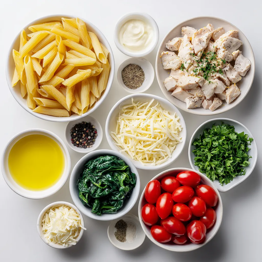The main ingredients for this dish are simple. You need uncooked penne pasta for the base. The diced chicken breast adds protein and flavor. Heavy cream gives that rich, creamy texture.