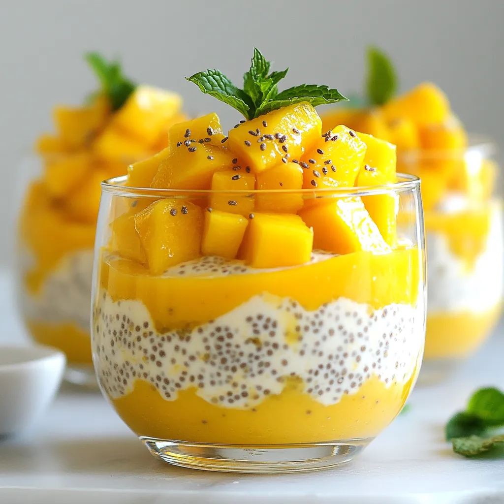To make creamy coconut mango chia pudding, gather these simple ingredients: - 1 cup coconut milk - 1 ripe mango, diced - 1/4 cup chia seeds - 2 tablespoons maple syrup or honey - 1/2 teaspoon vanilla extract - Pinch of salt - Fresh mint leaves for garnish Each ingredient adds a special touch. Coconut milk creates a rich, creamy base. Ripe mango adds sweetness and a burst of flavor. Chia seeds thicken the pudding and give it a fun texture. Maple syrup or honey sweetens the dish naturally. Vanilla extract enhances the overall taste, while a pinch of salt balances the flavors. Fresh mint leaves on top provide a nice, fresh finish. When you pick your mango, look for one that is soft but not mushy. This will ensure it is sweet and juicy. For the chia seeds, any brand will do, but make sure they are whole and fresh. Enjoy gathering these ingredients to create your delightful pudding! {{ingredient_image_1}} 1. Whisk the coconut milk mixture Start by grabbing a mixing bowl. Pour in 1 cup of coconut milk. Add 2 tablespoons of maple syrup and 1/2 teaspoon of vanilla extract. Sprinkle in a pinch of salt. Use a whisk to blend everything until it is smooth. 2. Stir in chia seeds Next, take 1/4 cup of chia seeds. Slowly stir them into your coconut milk mixture. Make sure they are evenly spread throughout. This step is key for a nice, thick pudding. 3. Refrigeration period Cover your bowl with plastic wrap. Place it in the fridge for at least 4 hours or overnight. The chia seeds will soak up the liquid and form a pudding-like texture. 4. Final stirring before serving After chilling, take the bowl out of the fridge. Give the pudding a good stir. This mixes any seeds that settled at the bottom. Your mixture should look creamy and thick. 5. Layering and presentation To serve, get clear glass cups. Spoon the creamy pudding into the cups. Alternate layers with diced mango. This creates a beautiful look. Finish by topping each cup with fresh mint leaves. They add a nice color and flavor. Remember, serve right away to enjoy the fresh taste! - Optimal chilling time: Chill the pudding for at least 4 hours. This lets the chia seeds soak up the coconut milk well. If you can wait overnight, do it! The texture gets even better. - Mixing techniques: Whisk the coconut milk and other liquids well. This helps the chia seeds mix in smoothly. When you stir, do it gently to avoid clumping. - Checking seed distribution: After chilling, stir the pudding again. This helps spread the chia seeds evenly. It makes each bite creamy and tasty. - Serving in clear glass cups: Use clear cups to show off the layers. You want to see the beautiful mango and creamy pudding. It makes the dish more inviting. - Drizzling coconut milk: Add a drizzle of coconut milk on top before serving. This makes it look fresh and adds a creamy touch to each bite. - Sprinkling chia seeds: Sprinkle a few extra chia seeds on top. This adds texture and makes your dish look fancy. Plus, it shows off the key ingredient! Pro Tips Use Ripe Mangoes: Make sure to select ripe mangoes for the best flavor and sweetness in your pudding. Chill Overnight: For a thicker and creamier texture, let the pudding chill overnight in the refrigerator. Variations: Experiment with different fruits like berries or kiwi to create your own unique pudding flavors. Serve with Toppings: Add a sprinkle of toasted coconut or nuts for an extra crunch and visual appeal. {{image_2}} You can change the taste of your creamy coconut mango chia pudding in fun ways. - Adding different fruits: Try bananas, strawberries, or blueberries. Each fruit adds unique flavor and color. You can mix fruits directly into the pudding or layer them on top. - Using flavored coconut milk: Coconut milk comes in many flavors. You can find chocolate, vanilla, or even coffee-flavored options. These add extra depth to your pudding. - Alternative sweeteners: If you want less sugar, try stevia, agave, or coconut sugar. Each sweetener changes the taste slightly. Choose what you like best! You can also adapt this pudding to fit your diet. - Vegan option: This recipe is already vegan-friendly! Just use maple syrup instead of honey. It keeps the pudding plant-based and delicious. - Low-sugar adjustments: If you want to cut sugar, use less maple syrup. You can also skip it or use unsweetened coconut milk. This way, you keep the pudding tasty without the extra sugar. Store any leftover creamy coconut mango chia pudding in an airtight container. Keep it in the fridge. It stays fresh for up to five days. The pudding may thicken over time. If that happens, add a little coconut milk before serving. This will help restore its creamy texture. You can freeze this pudding if you want to save it for later. First, pour the pudding into a freezer-safe container. Leave some space at the top, as it will expand when frozen. Seal it well to avoid freezer burn. It can last for about one month in the freezer. When you're ready to eat it, take the pudding out and put it in the fridge. Let it thaw overnight. If it is still too thick, mix in a splash of coconut milk. This will make it creamy again and ready to enjoy! Coconut mango chia pudding lasts about 4 to 5 days in the fridge. To keep it fresh, store it in an airtight container. This way, it will stay tasty for a longer time. Yes, you can use almond milk instead of coconut milk. The pudding will have a different taste but will still be creamy. Keep in mind that almond milk is thinner than coconut milk, so your pudding may not be as rich. Yes, chia pudding is very healthy. Chia seeds are full of fiber, protein, and omega-3 fatty acids. They help keep you full and support good digestion. Adding fruit like mango boosts vitamins and minerals too. You can make this pudding ahead of time. It needs at least 4 hours to chill, but overnight is best. This makes it perfect for meal prep or special events. You can use many toppings for chia pudding. Try sliced bananas, berries, or nuts for crunch. You ca