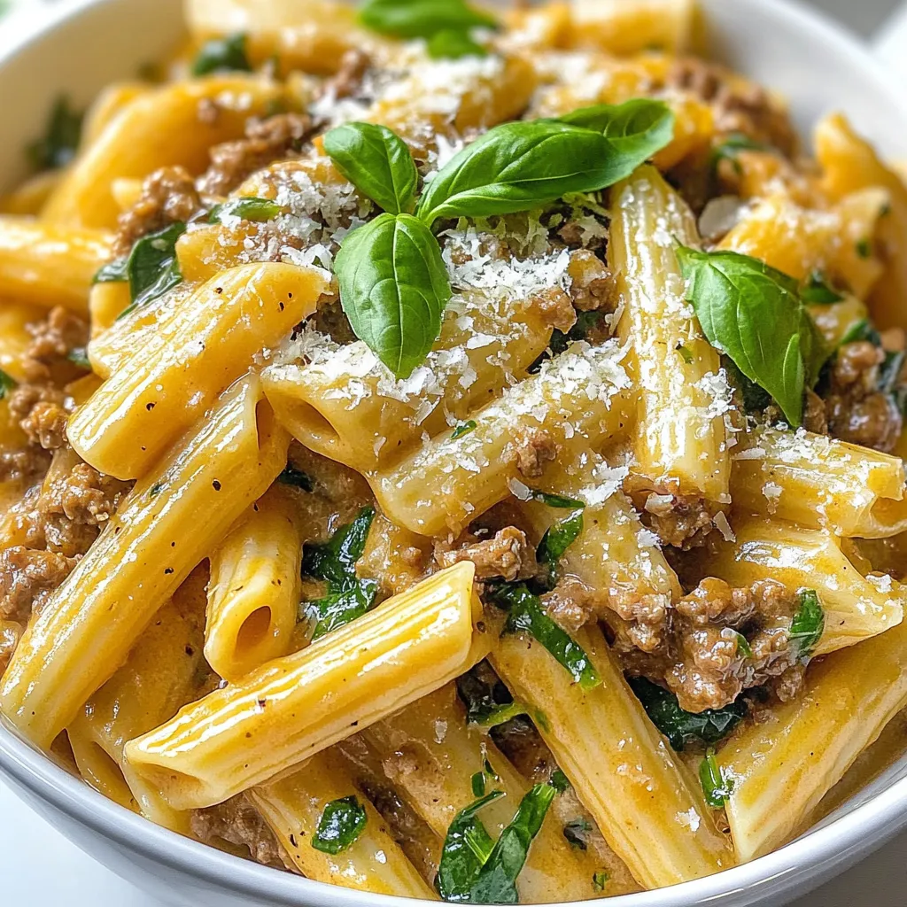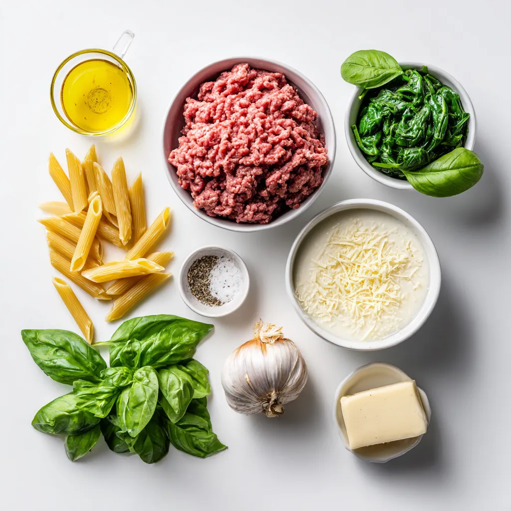 Gathering these ingredients sets you up for success. Ground beef gives a rich flavor. The pasta type can change the dish’s texture, so choose what you like best. Heavy cream adds that luscious creaminess we crave. Onion and garlic bring a fragrant base. Beef broth deepens the savory taste. Spinach adds nutrition and color. Parmesan cheese enriches the sauce with its salty bite. Olive oil helps sauté the veggies. Seasonings tie it all together. Don’t forget salt and pepper for flavor! Lastly, fresh basil brightens each bite if you choose to use it.