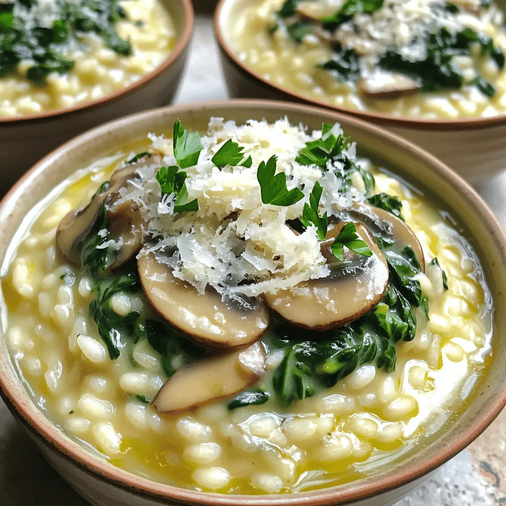 Let the risotto sit for a couple of minutes to thicken. When you serve it, use shallow bowls. Garnish with fresh parsley and a sprinkle of Parmesan. A drizzle of olive oil on top adds a nice touch. Enjoy your creamy spinach mushroom risotto!