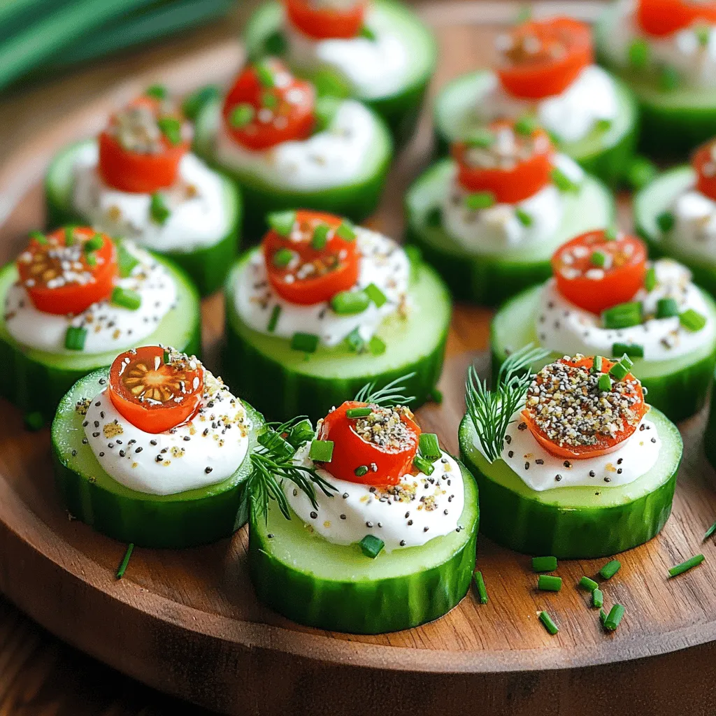 Think beyond just a plate! Arrange your cucumber bites on a wooden board for a rustic look. You can also stack them in a tall glass for a fun display. For a party, serve them on a tiered stand for a touch of elegance. Pair these bites with a light dip or spread, like tzatziki or hummus, for an extra treat. Adding colorful veggies around the platter can make it pop! These small changes can turn simple bites into a stunning centerpiece.