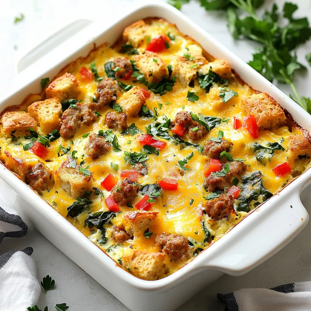 The main ingredients create a hearty base for this festive dish. Whole grain bread adds texture and flavor. Crumbled sausage gives it a meaty richness, while fresh spinach and red bell pepper bring color and nutrition. Eggs and milk bind everything together, adding creaminess.