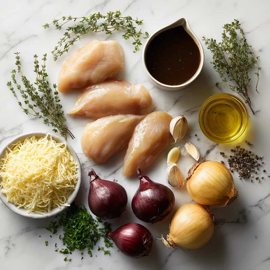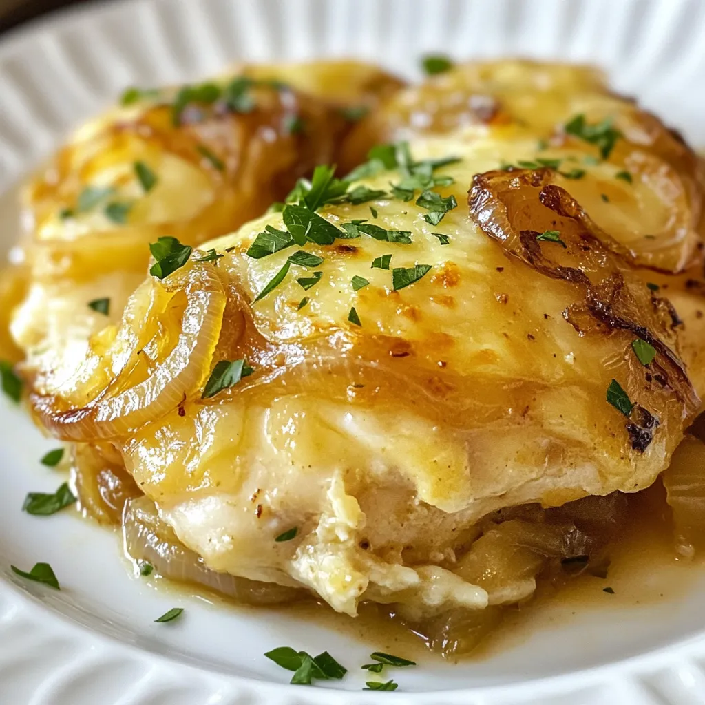 To make French Onion Chicken, gather these items: - 4 boneless, skinless chicken breasts - 2 large onions, thinly sliced - 3 cloves garlic, minced - 2 tablespoons olive oil - 2 tablespoons butter - 1 cup beef broth - 1 tablespoon balsamic vinegar - 1 teaspoon fresh thyme leaves (or ½ teaspoon dried thyme) - 1 cup shredded Gruyère cheese - Salt and pepper to taste - Fresh parsley, chopped (for garnish) You can swap ingredients as needed: - Chicken: Use boneless, skinless thighs for more flavor. - Onions: Sweet onions work well if you want a milder taste. - Beef broth: Vegetable broth is a great option for a lighter dish. - Thyme: Use Italian seasoning instead for a different flavor. - Gruyère cheese: Try mozzarella or cheddar if you prefer. Here are some helpful conversions: - 1 tablespoon = 3 teaspoons - 1 cup = 8 fluid ounces - 1 teaspoon = 5 milliliters - 2 tablespoons = 1 ounce - 1 pound = 16 ounces These conversions can help you adjust the recipe easily. Feel free to mix and match ingredients to suit your taste! {{ingredient_image_1}} To start, grab a large skillet. Heat two tablespoons of olive oil and two tablespoons of butter over medium heat. Once the butter melts, add two large onions that are thinly sliced. Cook the onions for about 15 to 20 minutes. Stir them often. You want them to turn caramelized and a nice golden brown. Near the end, add three cloves of minced garlic. Cook for one to two more minutes until it smells great. Now, let's prepare the chicken. Take four boneless, skinless chicken breasts and season them well. Use salt, pepper, and one teaspoon of fresh thyme leaves. Push the cooked onions to the side of the skillet. Place the chicken breasts in the center. Cook each side for about five minutes. You want the chicken to brown nicely. Next, pour in one cup of beef broth and one tablespoon of balsamic vinegar. This adds a rich flavor. Make sure to scrape the bottom of the skillet. This helps release all those tasty bits stuck to the pan. Bring the mixture to a gentle simmer. Cover the skillet and lower the heat. Let it cook for about 15 to 20 minutes. The chicken should reach an internal temperature of 165°F to be fully cooked. To get sweet, golden onions, start with medium heat. Use olive oil and butter for rich flavor. Stir the onions often. This helps them cook evenly. Aim for about 15 to 20 minutes. If they stick, add a splash of broth. This also helps lift the tasty bits from the pan. Keep going until they are soft and brown. To keep chicken moist, start with boneless, skinless breasts. Season them well with salt and pepper. Searing the chicken helps lock in juices. Cook it for about 5 minutes on each side. Make sure the heat is not too high. This prevents burning while keeping the inside juicy. After adding broth, cover the skillet. This keeps the steam in, making the chicken tender. For the best cheese melt, use Gruyère. It has a nice, creamy texture. After cooking, sprinkle it over the chicken. Cover the pan again for 2 to 3 minutes. This allows the cheese to get gooey and delicious. If you want more flavor, try adding a sprinkle of garlic powder or a dash of paprika before melting. Enjoy the cheesy goodness! Pro Tips Caramelization is Key: Make sure to cook the onions slowly over medium heat to achieve the perfect caramelization. This brings out their natural sweetness and enhances the dish's flavor. Deglaze for Depth: When adding the beef broth, don't forget to scrape the bottom of the skillet. This will lift the flavorful brown bits, adding depth to your sauce. Use a Meat Thermometer: To ensure your chicken is perfectly cooked, use a meat thermometer to check for an internal temperature of 165°F. Experiment with Cheese: While Gruyère is traditional, feel free to mix in other cheeses like Swiss or provolone for a unique twist on flavor. {{image_2}} To make a vegetarian version, swap the chicken for hearty mushrooms. Use portobello or cremini mushrooms for great flavor. Sauté them just as you would the chicken. They will soak up the broth and balsamic vinegar nicely. You can also add extra vegetables like bell peppers or zucchini for more texture. For a gluten-free dish, replace beef broth with a gluten-free version. Many brands offer gluten-free broth that works well. Always check the label to ensure it fits your needs. You can also use cornstarch or arrowroot to thicken the sauce if needed. To elevate the taste, try adding a splash of white wine along with the broth. This adds depth and richness. Fresh herbs like rosemary or sage can give a unique twist too. For a spicy kick, sprinkle in some red pepper flakes while cooking the onions. These small changes can make your dish stand out. After enjoying your French onion chicken, cool it down to room temperature. Place the chicken in an airtight container. Store it in the fridge for up to three days. Make sure to keep the onions and cheese with the chicken. This way, you keep all the great flavors together. To reheat, you can use a skillet or the microwave. If using a skillet, add a splash of broth to keep it moist. Heat over medium-low until hot. For the microwave, place the chicken on a plate. Cover it with a damp paper towel. Heat for 1-2 minutes, checking often. Both methods will help keep the chicken juicy. You can freeze French onion chicken too! Wrap each piece tightly in plastic wrap. Then place them in a freezer-safe bag. This will help avoid freezer burn. You can store it in the freezer for up to three months. When ready to eat, thaw it overnight in the fridge. Reheat as mentioned before for best results. French onion chicken is a savory dish. It combines tender chicken breasts with sweet, caramelized onions. The dish often features a rich beef broth and a layer of melted Gruyère cheese. This meal is comforting and delicious. It brings the classic flavors of French onion soup into a new form. You can serve it over rice, pasta, or with crusty bread. The blend of flavors makes it a family fav