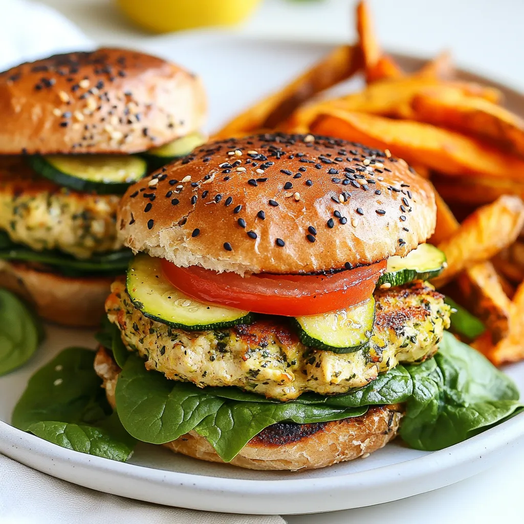 Assemble the burgers by placing the cooked chicken zucchini patty on the bun, topped with fresh spinach or lettuce, sliced tomato, and avocado.