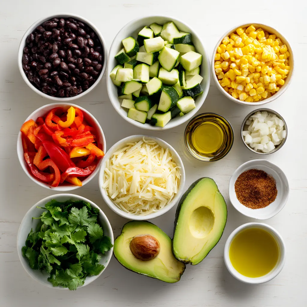 Each serving has about 300-350 calories. You get protein from beans and cheese. It also has healthy fats from the olive oil and avocado. This dish is high in fiber, thanks to beans and veggies. It’s a balanced meal you can feel good about!