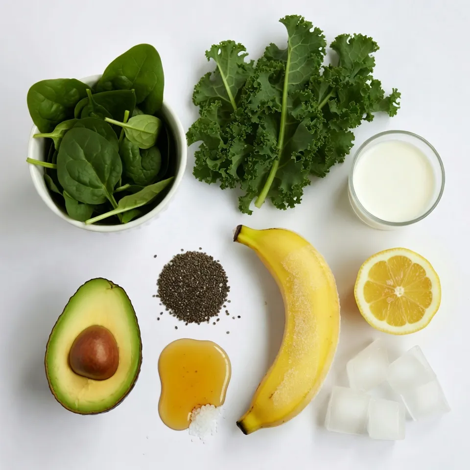 - 1 cup fresh spinach - 1/2 cup kale, stems removed - 1 ripe avocado, pitted and scooped - 1 medium banana, frozen - 1/2 cup almond milk (or coconut milk) - 1 tablespoon chia seeds - 1 tablespoon honey or agave syrup (optional) - Juice of 1/2 lemon - A pinch of sea salt - Ice cubes (optional) What is the nutritional value of spinach and kale? Spinach and kale are superfoods. They are packed with vitamins A, C, and K. These greens also have iron and calcium. Eating them can boost your immune system and help your bones. They are low in calories but high in fiber, making them great for digestion. What are the benefits of avocado in smoothies? Avocado adds creaminess to smoothies. It has healthy fats that keep you full longer. This fruit is rich in potassium and vitamins. These nutrients help with heart health and skin. Plus, its mild flavor pairs well with many ingredients. What are the advantages of chia seeds? Chia seeds are tiny but mighty! They are full of omega-3 fatty acids. These seeds also provide protein and fiber. They help with digestion and can keep you energized. When soaked, they form a gel that adds thickness to smoothies. {{ingredient_image_1}} 1. First, you need to combine the greens and avocado. Take your blender and add: - 1 cup fresh spinach - 1/2 cup kale, stems removed - 1 ripe avocado, pitted and scooped - 1 medium banana, frozen 2. Next, add the liquids and sweeteners. Pour in: - 1/2 cup almond milk (or coconut milk) - 1 tablespoon chia seeds - 1 tablespoon honey or agave syrup (optional) - Juice of 1/2 lemon - A pinch of sea salt 3. Now it’s time to blend until smooth. Blend on high. If needed, pause to scrape down the sides. This ensures everything mixes well. To achieve your desired thickness, you can do a few things. If you want it thicker, add ice cubes. Blend again until smooth. I often use ice cubes for a nice chill. If you want to freeze bananas, peel and slice them first. Place them in a bag and freeze. This makes blending easier. Plus, frozen bananas add creaminess. For presentation, you can pour your smoothie into a tall glass or bowl. Make it fun! Top with a sprinkle of chia seeds, a few slices of avocado, or a small handful of granola. Using a vibrant straw adds a nice touch. It makes drinking your smoothie feel special! You can also serve it in a bowl. This way, you can add toppings like nuts or seeds for extra crunch. To make your smoothie sweet, try honey or agave syrup. Just add one tablespoon to start. You can always add more if you like it sweeter. If you want a different taste, switch the almond milk for coconut milk. Coconut milk gives a rich, creamy flavor that works well with greens. A high-speed blender is the best tool for smoothies. It blends everything smoothly and evenly. Brands like Vitamix or Ninja are great choices. If you don't have a high-speed blender, don't worry! A regular blender can work too. Just blend longer to reach a smooth texture. You can also use a tamper tool to push down any stuck ingredients. Store leftover smoothies in the fridge. Use an airtight container for the best results. Smoothies are best enjoyed fresh, but they can last up to 24 hours. When blending, start with softer items like spinach and avocado. Then, add the liquids and harder items like chia seeds last. This helps everything blend well and prevents clumps. Pro Tips Fresh Ingredients Matter: Using fresh spinach and kale will enhance the flavor and nutritional value of your smoothie. Perfecting the Texture: For a creamier smoothie, ensure your banana is well-frozen and blend thoroughly. Experiment with Flavors: Try adding herbs like mint or basil for a unique twist on the classic green goddess flavor. Serving Suggestions: Serve with a side of protein, like a handful of nuts or a hard-boiled egg, for a complete meal. {{image_2}} You can switch up the greens in this smoothie. Try using romaine lettuce, swiss chard, or even arugula. Each green adds its unique taste and nutrients. For fruits, feel free to swap the banana. You can use mango, pineapple, or even berries. These fruits will change the flavor and sweetness. If you want to skip the honey, maple syrup or agave work well too. You can also omit the sweetener for a low-sugar option. To add a kick, try spices like ginger or cinnamon. A pinch of cayenne can make it spicy and fun. Adding fresh herbs like mint or basil can give a fresh taste. You can also mix in protein powders. Vanilla or chocolate protein powder can enhance the flavor. This extra boost makes it great for post-workout recovery or a filling snack. Using seasonal fruits and greens can keep your smoothie fresh and exciting. In spring, add fresh strawberries or peas. In summer, try peaches or blueberries. Fall is great for pumpkin puree or apples. Winter can bring in citrus fruits like oranges or grapefruits. For special occasions, you can make a festive smoothie for holidays. Top it with whipped coconut cream or colorful sprinkles for a fun treat. To store leftover smoothies, pour them into a sealed container. Glass jars work great. Leave some space at the top. Smoothies can expand when frozen. Store in the fridge for up to 24 hours. Shake well before drinking. To keep ingredients fresh, buy them in small amounts. Use fresh greens within a few days. Store spinach and kale in a plastic bag with a paper towel. This helps absorb moisture. Keep avocados at room temperature until ripe, then refrigerate. To freeze smoothies, pour them into ice cube trays. This makes them easy to use later. Once frozen, pop them into a bag. You can also freeze full servings in jars. Thaw them in the fridge overnight. Or blend them with some fresh liquid for a quick drink. Portioning smoothies into smaller containers helps with easy access. It saves time when you need a quick boost. Greens like spinach and kale should be used quickly. They lose nutrients fast. Aim to use them within a week. Avocados can be tricky. If they are ripe, use them in a few days. If they ar