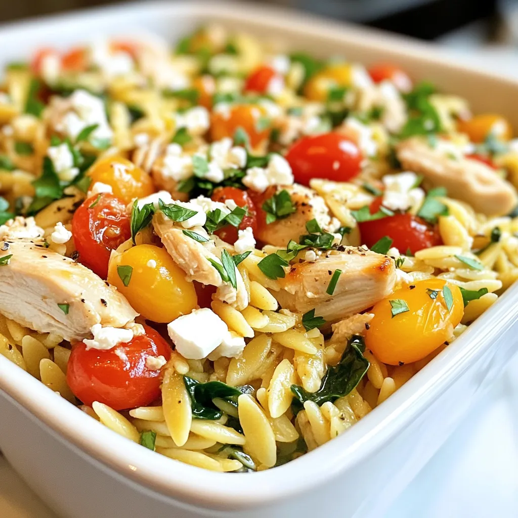 A nutritious and filling dish featuring orzo pasta, chicken, and fresh vegetables.