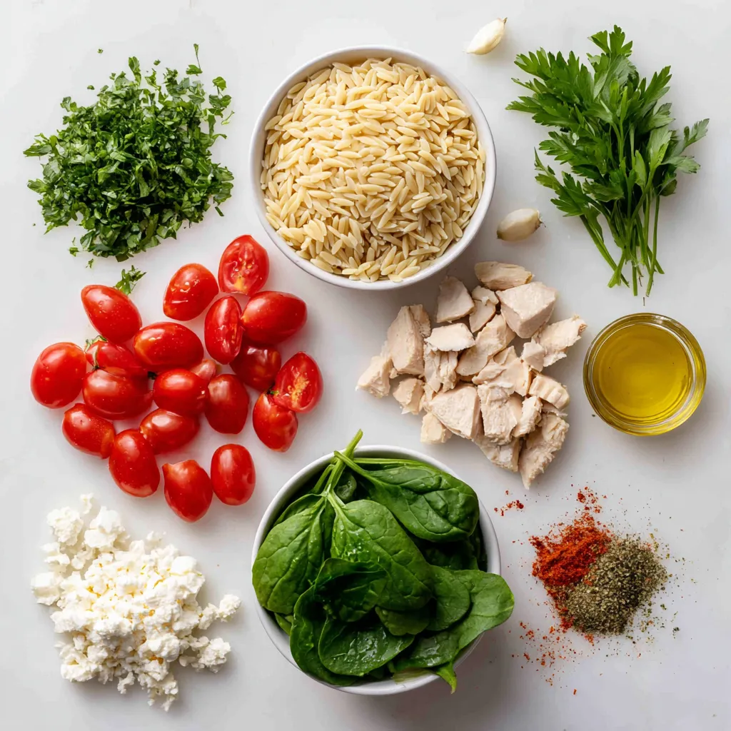 To make High Protein Chicken Orzo, start by preparing your ingredients. Gather: