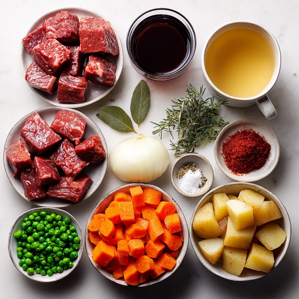 This list gives you everything you need for a hearty beef stew. The beef chuck is key. It gets tender as it cooks. The olive oil helps brown the meat and adds flavor. Onions and garlic build a base of taste. Carrots and potatoes add sweetness and texture.