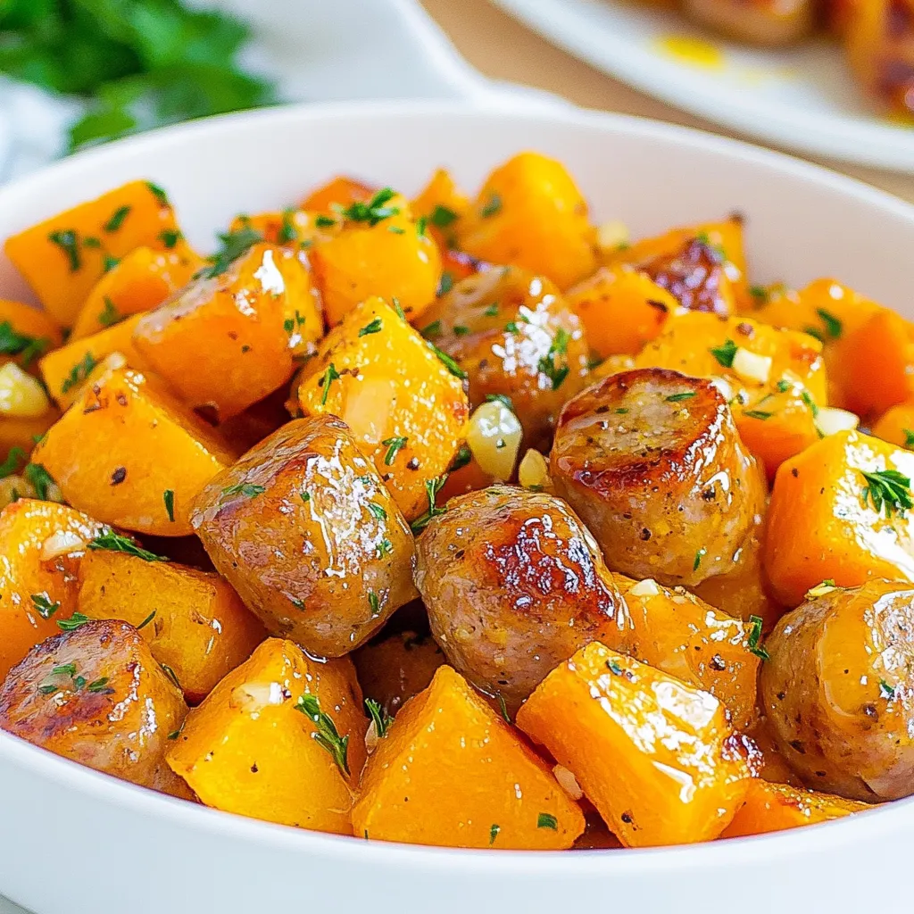 A delicious and hearty dish featuring roasted sweet potatoes and glazed sausage.