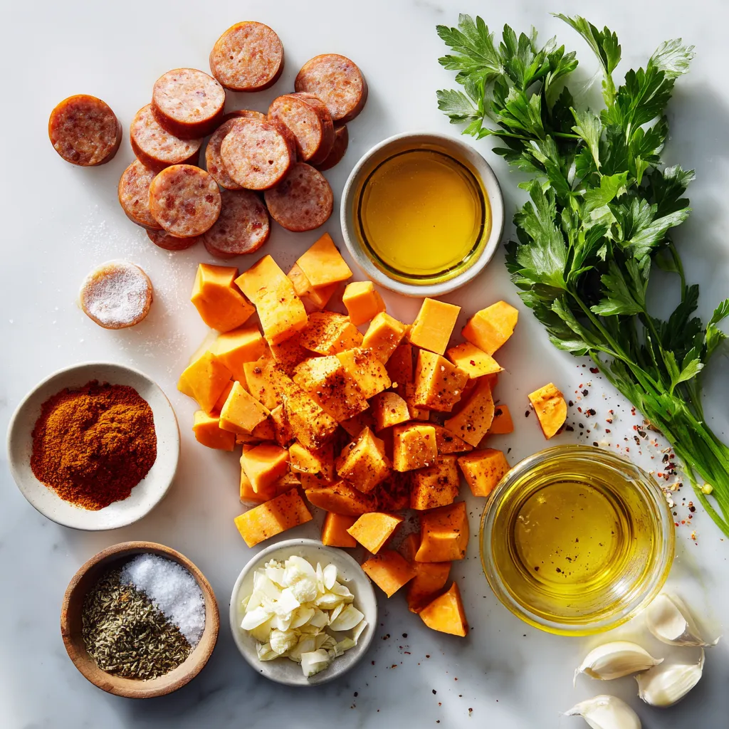 Gathering fresh ingredients is key to a great dish. Start with sweet potatoes. They give a sweet flavor and a lovely texture. I like to peel and dice them into bite-sized pieces.