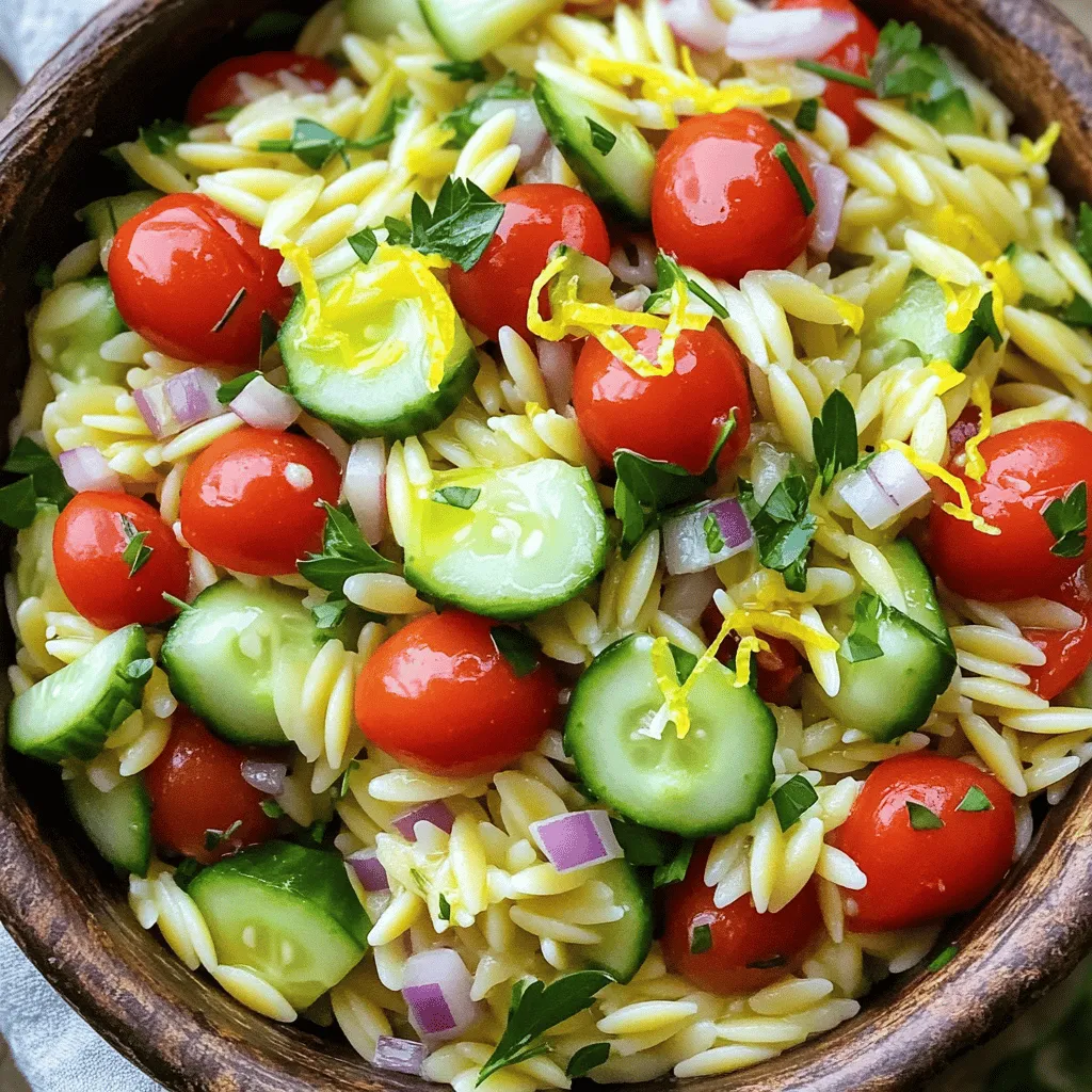 The main ingredients create a bright and fresh taste in the Lemon Garlic Orzo Salad. Orzo pasta is small and cooks quickly. The vegetable broth adds a rich flavor to the pasta. Fresh vegetables like cherry tomatoes, cucumber, and red onion give the dish color and crunch. Garlic, olive oil, lemon juice, and lemon zest bring a zesty kick that makes every bite special.