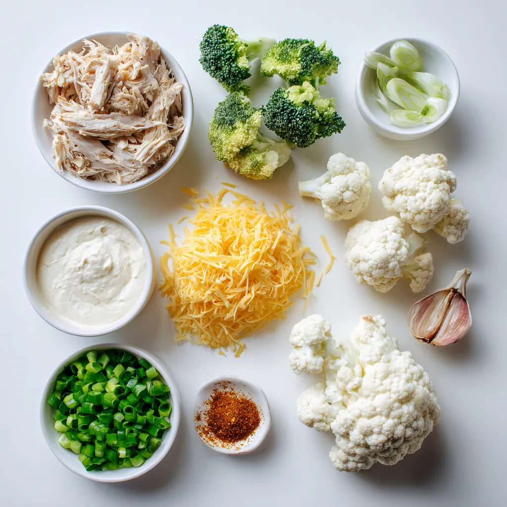 In a large mixing bowl, combine the shredded chicken, chopped cauliflower, and steamed broccoli.