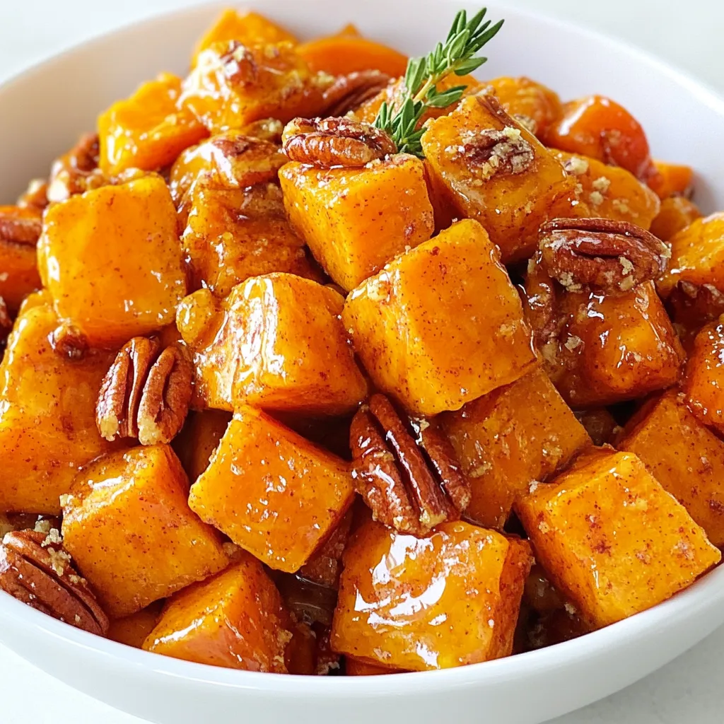 A delicious and sweet side dish featuring roasted sweet potatoes glazed with maple syrup and topped with pecans.