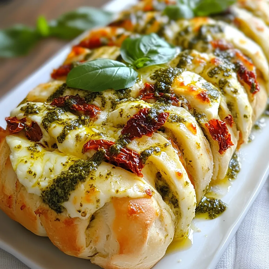 A delicious stuffed bread filled with mozzarella, pesto, and sun-dried tomatoes, perfect for sharing.