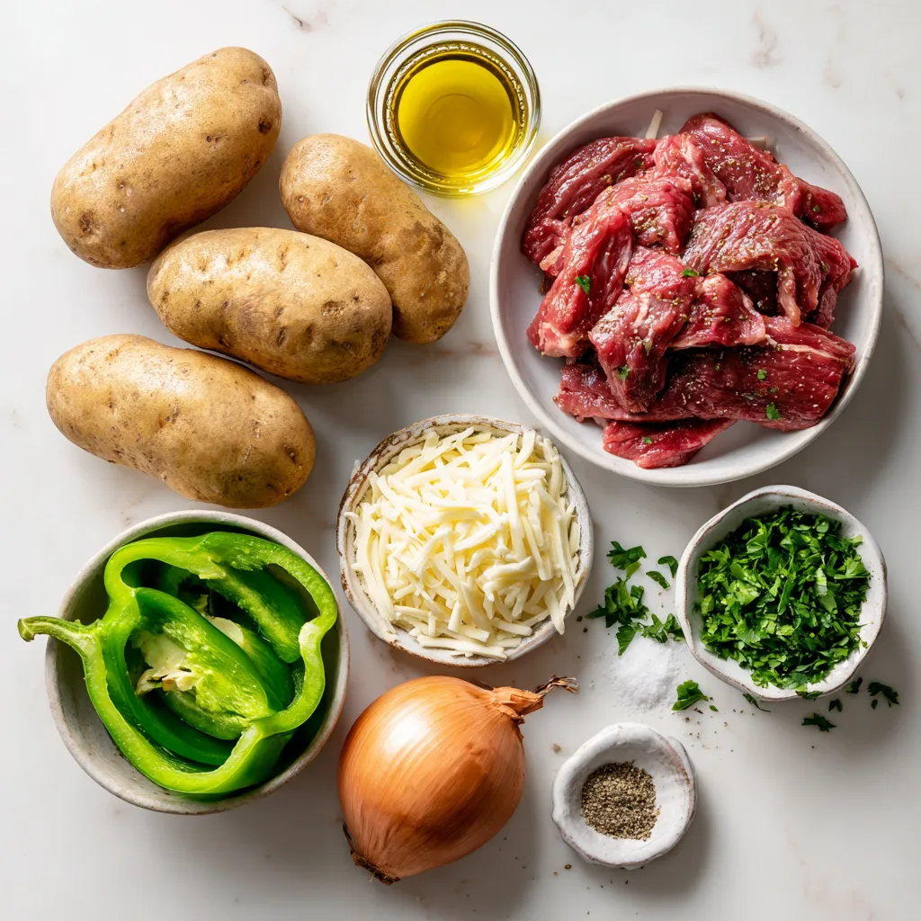 These ingredients are the heart of your Philly Steak Cheese Fries. The russet potatoes give you the perfect base. Their starchy texture turns crispy when baked. The beef sirloin is a must. It adds a rich, meaty flavor that pairs well with the cheese. Provolone cheese melts beautifully, creating a gooey layer on top. Fresh bell pepper and onion add color and sweetness.