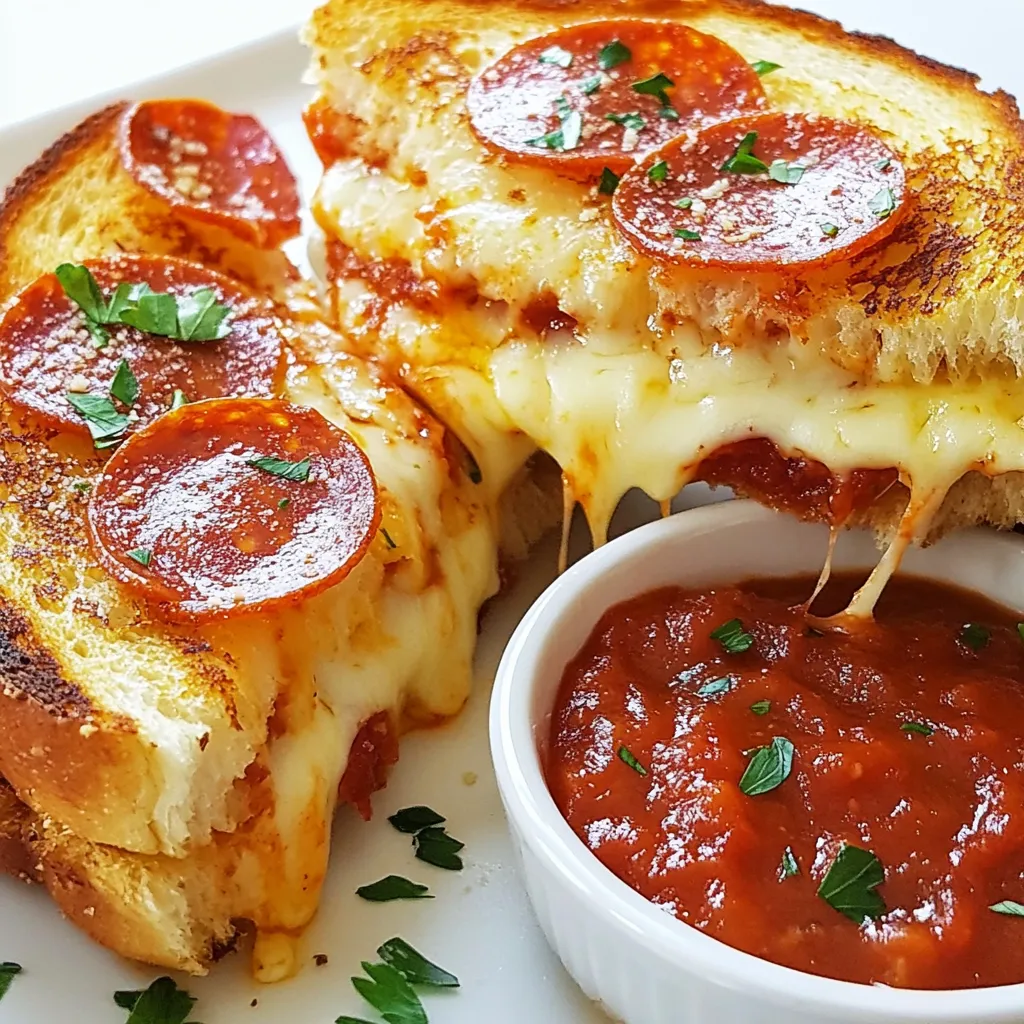 A delicious twist on the classic grilled cheese, combining the flavors of pizza with gooey cheese and crispy bread.