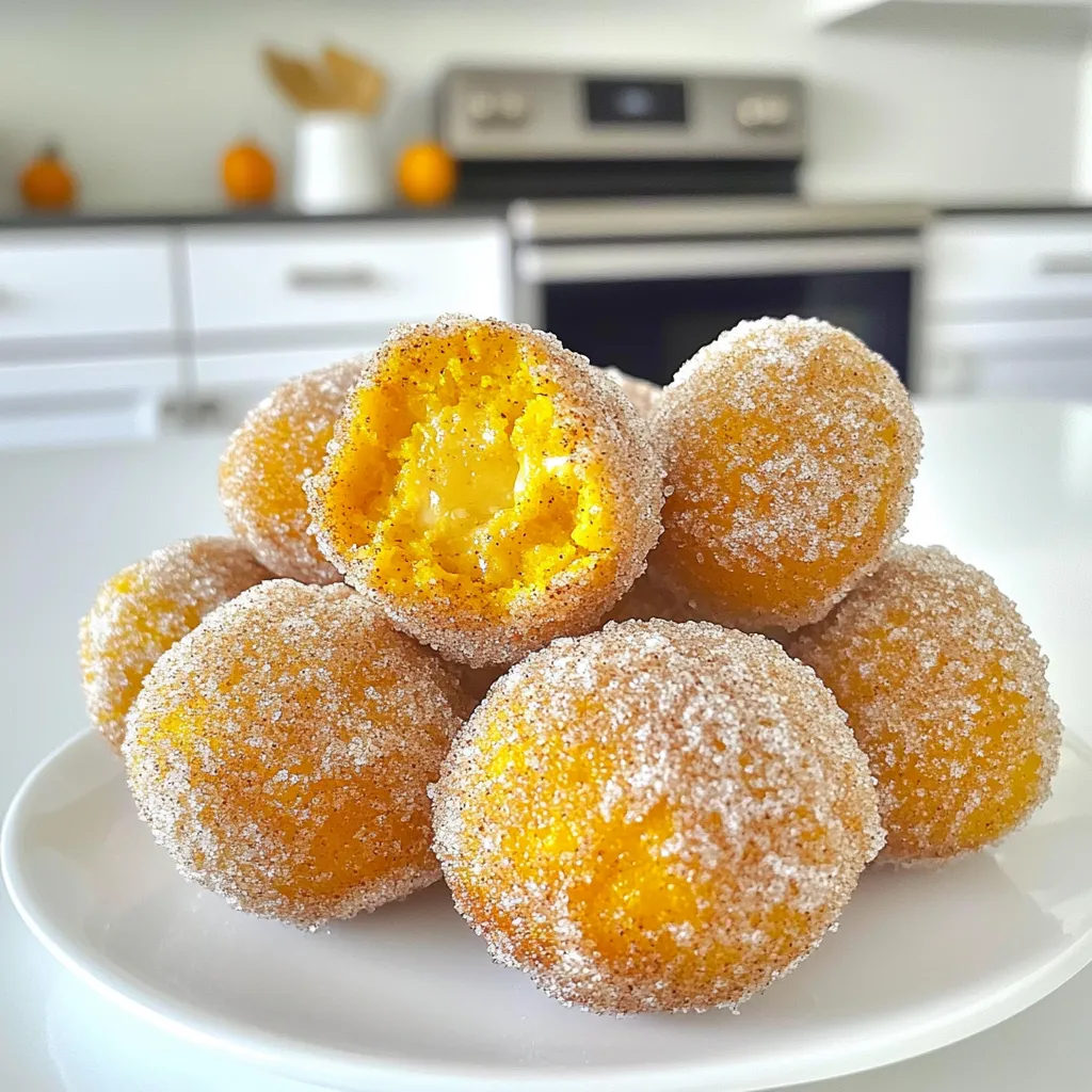 - 1 cup pumpkin puree - 1/2 cup granulated sugar - 1/4 cup brown sugar, packed - 2 large eggs - 1/2 cup vegetable oil - 1 teaspoon vanilla extract - 2 cups all-purpose flour - 2 teaspoons baking powder - 1 teaspoon ground cinnamon - 1/2 teaspoon ground nutmeg - 1/2 teaspoon ground ginger - 1/2 teaspoon salt - 1/4 teaspoon baking soda - 2 tablespoons butter, melted (for brushing) - 1/2 cup granulated sugar mixed with 2 teaspoons ground cinnamon (for coating) The main star of these baked treats is pumpkin puree. It adds flavor and moisture. You can use canned or fresh pumpkin. Both work great. The sugars add sweetness and help create a lovely crust. Eggs bind everything together and add richness. Vegetable oil keeps the donut holes moist and tender. Vanilla extract gives a warm touch. Spices bring out that classic pumpkin flavor. Ground cinnamon, nutmeg, and ginger add warmth. Don't forget the salt; it enhances the sweetness. Baking powder and baking soda help them rise. Finally, cinnamon sugar rolls add a sweet crunch. - 2 cups all-purpose flour - 2 teaspoons baking powder - 1/2 teaspoon salt - 1/4 teaspoon baking soda - 1/2 cup granulated sugar mixed with 2 teaspoons ground cinnamon (for coating) Flour is the base of the batter. It gives structure to the donut holes. Baking powder and baking soda are crucial for leavening. They make these donut holes soft and fluffy. Salt enhances all the flavors. The cinnamon sugar coating adds sweetness and a hint of spice. It makes every bite feel special. With these ingredients, you’re set to create something delicious. 1. First, preheat your oven to 350°F (175°C). This heat helps the donut holes rise well. 2. Next, lightly grease a mini muffin tin or a donut hole pan. This step will keep them from sticking. 3. In a large bowl, mix together the pumpkin puree, granulated sugar, brown sugar, eggs, vegetable oil, and vanilla extract. Stir until smooth and well blended. 1. In another bowl, whisk together the flour, baking powder, ground cinnamon, ground nutmeg, ground ginger, salt, and baking soda. 2. Make sure all dry ingredients are mixed well. This helps distribute flavors evenly in the batter. 1. Gradually add the dry mix to the wet ingredients. Stir gently until just combined. The batter should be thick and slightly lumpy. Do not overmix! 2. Use a small cookie scoop or a spoon to fill each cavity of the muffin pan about three-quarters full with the batter. 3. Bake your donut holes in the preheated oven for about 12-15 minutes. To check, insert a toothpick into the center. If it comes out clean, they are done. 4. While they bake, prepare the cinnamon sugar mixture in a shallow bowl. 5. After baking, let the donut holes cool in the pan for about five minutes. Then, gently remove them and place them on a wire rack. 6. While still warm, brush each donut hole with melted butter. Roll them in the cinnamon sugar mixture until they are evenly coated. Enjoy these tasty pumpkin donut holes warm or store them in an airtight container for up to three days. To get the best texture in your pumpkin donut holes, avoid overmixing. When you combine the wet and dry ingredients, stir gently until just mixed. The batter should look thick and a bit lumpy. Overmixing makes the donut holes tough. For fluffy donut holes, ensure your baking powder is fresh. Old baking powder won't provide the lift you need. Also, don't skip the cinnamon and nutmeg; they add warmth and depth. Enjoy your pumpkin donut holes warm. They taste best right after baking. Serve them plain or roll them in cinnamon sugar for sweetness. For a fun twist, pair them with a warm drink, like apple cider or coffee. You can also drizzle a bit of maple syrup on top for extra flavor. Feel free to add other flavors to your donut holes. You can mix in chocolate chips or nuts for extra texture. If you love spices, try adding a pinch of allspice or cloves. For a fun topping, try a cream cheese glaze. Just mix cream cheese with a bit of powdered sugar and milk. {{image_2}} You can change up the flavor of these pumpkin donut holes in fun ways. Here are two ideas: - Pumpkin Spice Donut Holes: This is the classic version. It has warm spices like cinnamon, nutmeg, and ginger. The pumpkin taste shines through, making each bite cozy and comforting. - Chocolate Chip Pumpkin Donut Holes: If you love chocolate, this one is for you. Just add 1 cup of chocolate chips to the batter. The sweet chocolate pairs well with the pumpkin, adding richness and delight. You can also make these donut holes fit your diet. Here are some options: - Gluten-free alternatives: Use a gluten-free flour blend instead of all-purpose flour. Look for a blend with xanthan gum to help with texture. - Vegan options: To make these vegan, replace the eggs with 1/2 cup of applesauce or 1/4 cup of flaxseed meal mixed with water. Use a plant-based oil for the batter and vegan butter for brushing. These variations keep the recipe fun and inclusive for different tastes and diets. Feel free to experiment with your favorite flavors! To keep your pumpkin donut holes fresh, store them in an airtight container. This helps to lock in moisture and flavor. Place the container at room temperature. They stay good for up to three days. If you notice them getting dry, try reheating them in the microwave for a few seconds. This brings back their softness. If you want to save some for later, freezing is a great option. First, let the donut holes cool completely on a wire rack. Once cool, arrange them in a single layer on a baking sheet. Freeze for about two hours. This prevents them from sticking together. After freezing, transfer them to a freezer-safe bag or container. They can stay in the freezer for up to three months. When you are ready to enjoy them, just thaw at room temperature or reheat them in the oven. Enjoy your treats whenever you crave them! You can check if the donut holes are ready by inserting a toothpick into the center. If it comes out clean, they are d