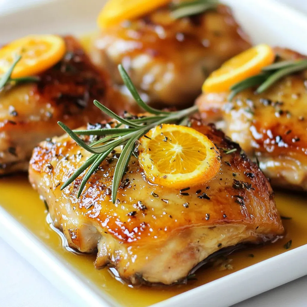 - 4 chicken thighs (bone-in, skin-on) - 2 oranges (juice and zest) - 1 tablespoon soy sauce - 2 tablespoons honey - 4 garlic cloves, minced - 1 teaspoon fresh ginger, grated - 1 tablespoon olive oil - Salt and pepper to taste - Fresh rosemary sprigs for garnish - Large mixing bowl - Whisk - Roasting pan - Meat thermometer (optional) Gathering the right ingredients and tools makes cooking fun and easy. I love using chicken thighs for this dish. Their juicy meat stays tender during roasting. The skin adds flavor and crispness. Fresh oranges are key. The juice and zest bring bright, tangy notes. The marinade is simple yet powerful. You need soy sauce for saltiness, honey for sweetness, and garlic for depth. Ginger adds a warm, spicy kick. Olive oil keeps everything moist. Don't skip salt and pepper; they enhance all flavors. For tools, a large mixing bowl helps combine all ingredients easily. A whisk ensures you blend the marinade well. A roasting pan is perfect for cooking the chicken evenly. If you have a meat thermometer, it can help check if the chicken is done. With these ingredients and tools, you're ready to create a delicious meal! {{ingredient_image_1}} To start, gather your ingredients. You will need orange juice, orange zest, soy sauce, honey, minced garlic, grated ginger, olive oil, salt, and pepper. In a large mixing bowl, combine the orange juice and zest with the other marinade ingredients. Use a whisk to mix everything well. This helps the flavors blend nicely. Next, take your chicken thighs and add them to the bowl with the marinade. Make sure they are well coated. For the best flavor, marinate them for at least 30 minutes. If you have time, marinating overnight in the fridge works even better. This adds more depth to the dish. Now it’s time to roast. Preheat your oven to 400°F (200°C). In a roasting pan, arrange the chicken thighs skin-side up. Pour the leftover marinade over the chicken. This will keep it juicy while it cooks. Roast for about 35-40 minutes. To enhance the flavor, baste the chicken with the marinade halfway through cooking. This step makes a big difference in taste. To get that delicious crispy skin, always use bone-in, skin-on thighs. This cut holds moisture well and cooks evenly. During roasting, place the chicken skin-side up in the pan. Roasting at a high temperature helps the skin get golden and crispy. Basting the chicken halfway through adds flavor and keeps the skin nice. For the best flavor, marinate your chicken overnight. This lets the flavors soak in deeply. You can also add herbs like thyme or spices like paprika to the marinade. This will give the chicken more depth and make it even better. Serve the roasted orange chicken on a big platter. Drizzle pan juices over the top for a nice touch. Pair it with steamed rice and sautéed green beans. This pairing gives a colorful and complete meal. For plating, arrange the green beans beside the chicken and sprinkle rosemary for a fresh look. Pro Tips Marinate Longer for Depth: For the best flavor, marinate the chicken thighs overnight. This allows the flavors to penetrate deeply into the meat. Use Fresh Ingredients: Fresh garlic and ginger can significantly enhance the flavor of your marinade compared to dried or powdered versions. Monitor Cooking Time: Cooking times can vary based on oven efficiency and chicken size. Always check that the internal temperature reaches 165°F (75°C). Baste for Extra Crispiness: Basting the chicken with the marinade halfway through roasting helps to achieve a crispy and flavorful skin. {{image_2}} You can switch up the flavor by using other citrus fruits. Lemon or lime can add a bright twist to your roasted orange chicken. If you use lemon, it brings a nice tartness. Lime adds a fresh zest that can uplift the dish. Just replace the orange juice and zest with an equal amount of your chosen citrus. This small change can create a whole new taste experience. Want to spice things up? Adding heat can elevate the dish. Red pepper flakes are a great choice. You can sprinkle them into the marinade. Start with a pinch and adjust to your taste. If you like more heat, add more flakes. This will give the chicken a kick and balance the sweetness of the orange. If you need a gluten-free option, tamari or coconut aminos work well. Both can replace soy sauce without losing flavor. Use the same amount as the soy sauce in the recipe. This simple swap makes the dish safe for those avoiding gluten. Enjoy the same great taste while keeping it friendly for all diets. To keep your roasted orange chicken fresh, store it in the fridge. Place the chicken in an airtight container. This helps prevent it from drying out. Enjoy your leftovers within three to four days for the best taste. If you want to save it longer, freezing is a great option. Wrap each piece of chicken tightly in plastic wrap. Then, place them in a freezer bag. Be sure to remove as much air as possible. Frozen chicken can last up to three months. Just label the bag with the date. To reheat your chicken, the oven works best. Preheat it to 350°F (175°C). Place the chicken on a baking sheet. Cover it with foil to keep it moist. Heat for about 15 to 20 minutes or until warm. If you're short on time, you can use the microwave. Place the chicken on a microwave-safe plate. Cover it with a damp paper towel to keep it from drying out. Heat on medium power for about 2 to 3 minutes. Check if it's warm enough. If not, continue heating in 30-second increments. Enjoy your flavorful chicken just like the first time! Marinate the chicken for at least 30 minutes. This time helps the flavors soak in. For best results, marinate overnight in the fridge. The extra time makes the chicken taste amazing. Yes, you can use chicken breasts. However, they cook faster than thighs. Chicken breasts take about 25 to 30 minutes to cook. Thighs need around 35 to 40 minutes. Thighs stay juicier and have more flavor, while breasts can dry out if overcooked. Y