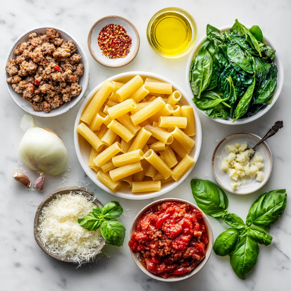 The key to a great sausage rigatoni is in the ingredients. Each one plays a role in flavor and texture. Rigatoni, with its ridges, holds sauce well. I love using Italian sausage for its bold taste. You can choose mild or spicy, depending on how much heat you want.