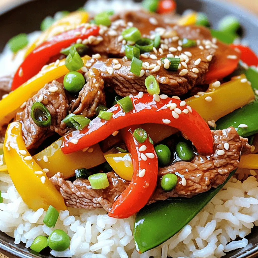 To make this tasty dish, you need: - 1 lb (450g) beef sirloin, thinly sliced - 2 tablespoons sesame oil - 4 cloves garlic, minced - 1 tablespoon fresh ginger, grated - 2 bell peppers (red and yellow), sliced - 1 cup snap peas, trimmed - 3 green onions, chopped - 1 tablespoon soy sauce - 1 tablespoon hoisin sauce - 1 tablespoon rice vinegar - 1 tablespoon sesame seeds - Salt and pepper to taste - Cooked jasmine rice, for serving These ingredients work well together. They create a mix of flavors and textures. The beef gives you protein, while the veggies add crunch. The sauces tie everything together with a savory taste. You can add more ingredients if you like. Some good options are: - Sliced carrots for sweetness - Broccoli florets for extra crunch - Crushed red pepper for heat - Cashews for a nutty twist These ingredients can change the taste and feel of the dish. Feel free to mix them based on what you enjoy! You will need some key tools to cook this stir fry: - A large skillet or wok for even cooking - A sharp knife for slicing the beef and veggies - A cutting board for prep work - Measuring spoons for accurate sauce amounts With these tools, your cooking process will be smooth and fun! Start by slicing 1 pound of beef sirloin into thin strips. Place the beef in a bowl. Sprinkle a pinch of salt and pepper over the beef. Toss it well to coat. Let it sit for about 10 minutes. This helps the beef absorb the flavors. Heat 2 tablespoons of sesame oil in a large skillet or wok. Use medium-high heat until the oil shimmers. Add the beef in a single layer. Cook for 2 to 3 minutes on each side. You want the beef browned but not fully cooked. Once done, remove it from the pan and set it aside. In the same skillet, add 4 minced garlic cloves and 1 tablespoon of grated ginger. Stir-fry these for about 30 seconds. This step wakes up the flavors. Next, toss in 2 sliced bell peppers and 1 cup of trimmed snap peas. Stir-fry for 2 to 3 minutes until they soften but stay crisp. Return the beef to the skillet. Add 1 tablespoon each of soy sauce, hoisin sauce, and rice vinegar. Stir everything well. Cook for an additional 2 to 3 minutes. This allows the beef to finish cooking and soak up the sauce. Once completed, remove from heat. Garnish with chopped green onions and sesame seeds before serving. To get the best texture, slice your beef thinly. Thin slices cook fast and stay tender. Make sure your skillet is hot before adding the beef. This helps it sear quickly. Don’t overcrowd the pan; cook in batches if needed. This step keeps the beef juicy and not soggy. You can swap beef sirloin for chicken or tofu if you prefer. Try adding broccoli or carrots for more color. If you like heat, toss in some red pepper flakes. For a sweeter taste, add pineapple chunks. Always taste as you go to adjust flavors. Serve this stir fry over fluffy jasmine rice. For a crunchy touch, sprinkle more sesame seeds on top. You can also add a side of spring rolls or a fresh salad. Pair it with a light soy sauce or a spicy dipping sauce for extra flavor. Enjoy this meal as a quick and tasty dinner option! {{image_2}} You can switch up the beef for other proteins. Chicken or shrimp works well here. Both cook fast and take on flavors easily. If you're looking for a vegetarian twist, use tofu instead. Just press and cube it before cooking. This option absorbs the sauce nicely and adds a great texture. Feel free to mix in your favorite veggies. Broccoli or carrots add crunch and color. You can also try mushrooms for a savory kick. Spinach or bok choy can offer a nice soft touch. Be creative! Use what you have in your fridge for a fresh twist on this dish. To make this dish gluten-free, swap soy sauce for a gluten-free version. Tamari is a great choice and tastes similar. Always check labels to ensure no hidden gluten sneaks in. Pair it with rice that’s labeled gluten-free for a safe, tasty meal. To keep your Sesame Garlic Beef Stir Fry fresh, store leftovers in an airtight container. Let the dish cool to room temperature before sealing it. Place it in the fridge within two hours of cooking. Proper storage helps maintain flavor and texture. You can keep it in the fridge for up to three days. When you reheat your stir fry, do it gently. Use a skillet over medium heat for even warming. Add a splash of water or broth to keep it moist. Stir occasionally to heat evenly and avoid burning. You can also use the microwave, but cover it to prevent drying out. Heat in short bursts, stirring in between until warm. If you want to freeze your stir fry, it’s best to do so before adding the fresh green onions and sesame seeds. Place the cooled stir fry in a freezer-safe container. It can last up to three months in the freezer. When ready to eat, thaw it overnight in the fridge. Reheat thoroughly before serving. Yes, you can use other cuts. Flank steak or ribeye work well. Just slice them thin. Thin slices help the beef cook fast and stay tender. You can even use chicken, pork, or tofu if you prefer. To add spice, include red pepper flakes or sliced fresh chili peppers. You can also use spicy sauces like Sriracha or chili garlic sauce. Start with a small amount and taste as you go. Adjust to your heat level. This stir fry goes great with jasmine rice or fried rice. You can also serve it with steamed broccoli or bok choy. A simple cucumber salad adds a fresh crunch too. For a light meal, serve with spring rolls or dumplings. In this article, we looked at how to make sesame garlic beef stir fry. We covered essential and optional ingredients, cooking steps, and helpful tips. You learned how to customize this dish with different proteins and veggies. Proper storage and reheating methods keep leftovers fresh. Remember, cooking is all about fun and making it your own. Enjoy your tasty stir fry, and don’t be afraid to experiment!