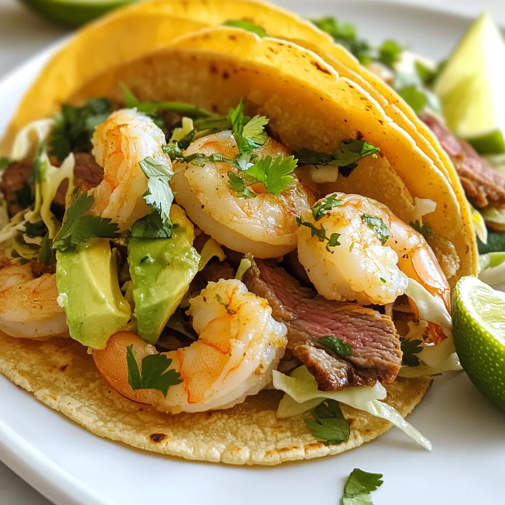 Surf and Turf Tacos are a fun mix of land and sea flavors. They combine juicy flank steak and tender shrimp, wrapped in corn tortillas. You add fresh toppings like avocado and cabbage for extra crunch. This dish offers a great balance of savory meat and sweet seafood. It’s perfect for taco night or any casual meal.