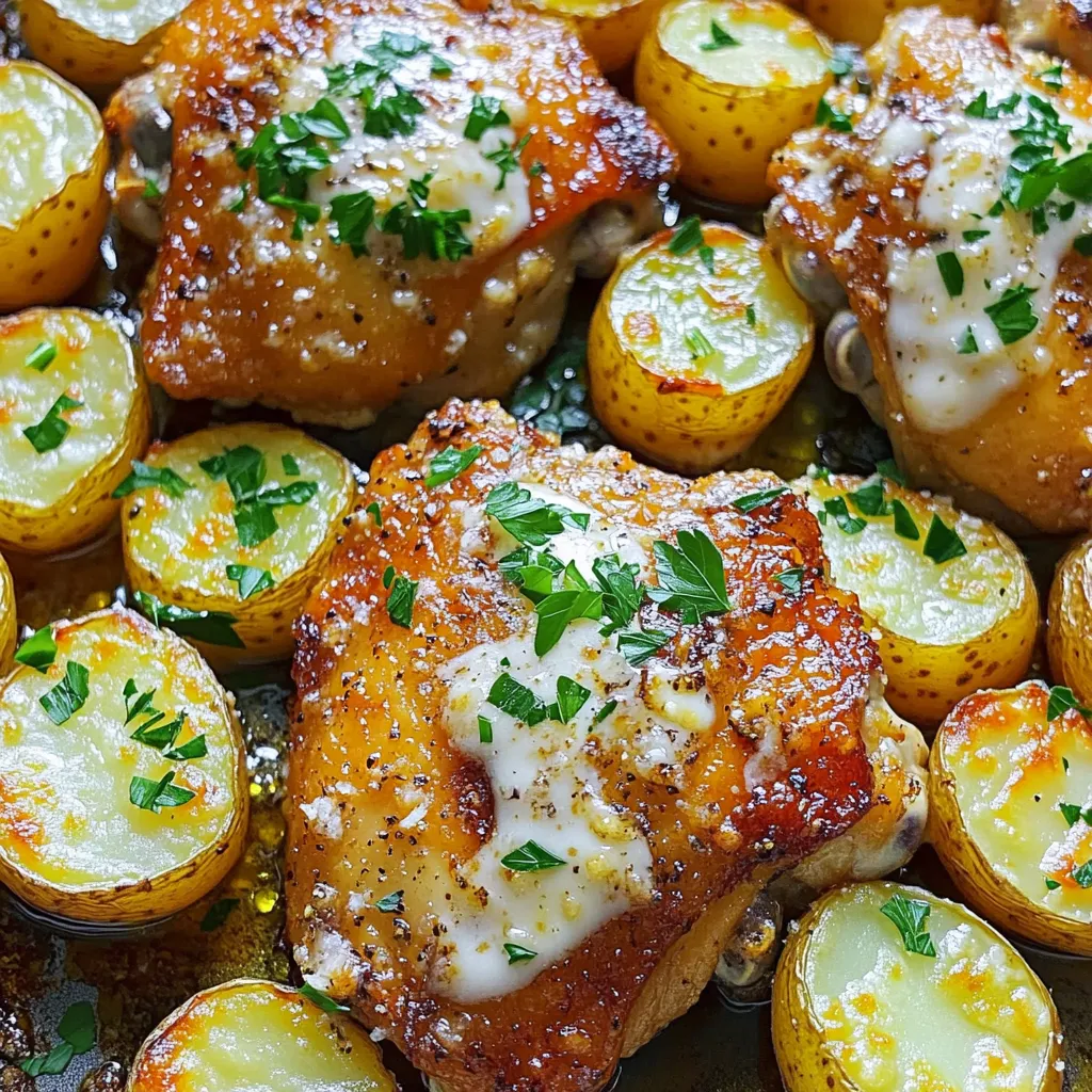 Grab a large sheet pan and arrange the marinated chicken thighs on it, skin-side up. Space them out to allow for even cooking. Now, add the seasoned baby potatoes around the chicken.