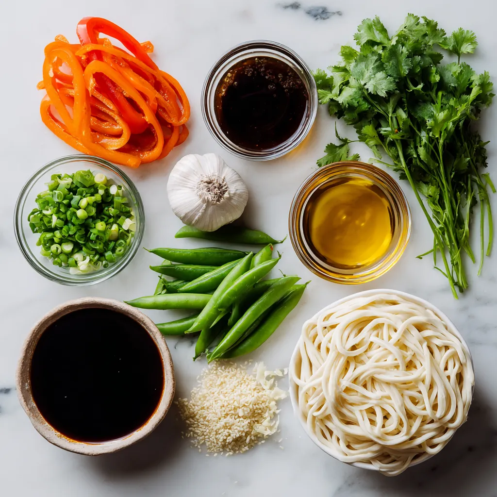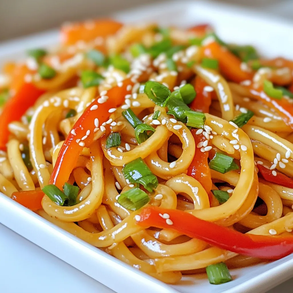 - 12 oz udon noodles - 2 tablespoons soy sauce - 1 tablespoon oyster sauce (optional) - 1 red bell pepper, sliced - 1 cup sugar snap peas - 1 medium carrot, julienned - 5 green onions, chopped - 2 cloves garlic, minced - 1 teaspoon fresh ginger, grated - Sesame seeds for garnish - Fresh cilantro for garnish (optional) I love the bright and fresh flavors in this recipe. The udon noodles are thick and chewy, perfect for soaking up the sauces. The soy sauce gives a rich flavor, while the oyster sauce adds depth if you choose to use it. For the veggies, I pick a red bell pepper for its sweetness. Sugar snap peas add a nice crunch, while the carrot adds vibrant color and sweetness. Green onions give the dish a nice bite. Don't skip the garlic and ginger! They add a warm and spicy touch. Finally, top with sesame seeds and cilantro for a pop of flavor and color. These ingredients come together to create a tasty meal you can enjoy any night of the week! {{ingredient_image_1}} - Preheat the oven to 425°F (220°C). This step is key for a great roast. - Cook udon noodles according to package instructions. Make sure they are al dente. Drain and set aside. You want them just right, not mushy. - On a large sheet pan, combine sliced red bell pepper, sugar snap peas, and julienned carrot. - Drizzle with 1 tablespoon of sesame oil and toss them well. This adds flavor and helps with roasting. - Roast the vegetables in the oven for 10 minutes. Stir halfway through so they cook evenly. They should be tender and slightly caramelized when done. - In a large bowl, whisk together soy sauce, oyster sauce (if using), and the remaining tablespoon of sesame oil. Add minced garlic and grated ginger. Mix well to combine. - After the vegetables roast, add the cooked udon noodles to the sheet pan. Pour the soy sauce mixture over everything. Toss to coat all the noodles and veggies. - Return the sheet pan to the oven and roast for an additional 5-7 minutes. This warms everything up and lets the noodles soak up the sauce. Now you’re ready to enjoy a delicious and easy meal! To ensure the udon noodles are cooked al dente, follow the package instructions closely. Start boiling the water well before adding the noodles. Check them a minute or two before the time is up. They should be firm yet tender. For roasting vegetables, timing is key. Roast the red bell pepper, sugar snap peas, and carrots for about 10 minutes. Stir halfway to avoid uneven cooking. They should be slightly tender and caramelized for the best flavor. For a beautiful finish, sprinkle sesame seeds and chopped green onions on top. The seeds add a nice crunch. If you like, add fresh cilantro for color and freshness. Mix them together or layer them for an appealing look. You can serve the dish straight from the sheet pan for a casual vibe. If you prefer, transfer it to a large serving dish to impress guests. Make sure to garnish with extra sesame seeds and cilantro. This makes the dish pop with color and taste. Enjoy it warm for the best experience! Pro Tips Cook Noodles Al Dente: For the best texture, cook the udon noodles just until they're al dente. They will continue to cook slightly when you roast them with the vegetables. Customize Your Veggies: Feel free to add any of your favorite vegetables to the sheet pan, such as broccoli, mushrooms, or zucchini, to enhance the flavor and nutrition. Make It Spicy: If you enjoy a bit of heat, add some red pepper flakes or sliced fresh chili peppers to the soy sauce mixture before tossing everything together. Garnish Wisely: For added flavor, consider garnishing with toasted sesame oil drizzled on top just before serving, alongside the sesame seeds and cilantro. {{image_2}} You can swap the oyster sauce for a vegetarian option. Use a vegetarian oyster sauce to keep the umami flavor. You can also mix soy sauce with hoisin sauce for a sweet twist. If you want something lighter, try a splash of rice vinegar. All these swaps will keep your dish tasty and full of flavor. Adding protein can make your meal heartier. Chicken, shrimp, or tofu work great in this dish. For chicken, use thin slices to cook quickly and blend well. Shrimp cooks fast, so add it just before the final roasting. If you prefer tofu, press and cube it first. Toss it in with the veggies for a lovely texture. Feel free to customize your veggies. Broccoli, snap peas, or bell peppers add color and crunch. Zucchini or bok choy can also fit in nicely. Try using frozen mixed vegetables if you’re short on fresh ones. They save time and still taste great when cooked properly. After enjoying your Sheet Pan Soy Sauce Udon, you may have leftovers. To store them, let the dish cool down. Then, place it in an airtight container. This keeps your meal fresh. Store it in the fridge. Enjoy it within three to four days for the best taste. If you want to keep your udon for a longer time, freezing is great. First, let the dish cool completely. Next, pack it in a freezer-safe container. You can also use freezer bags. Make sure to remove excess air. This helps prevent freezer burn. When you're ready to eat, thaw it overnight in the fridge. Reheat it in a pan over low heat. Add a splash of water or soy sauce for moisture. Leftovers from your Sheet Pan Soy Sauce Udon will last in the fridge for about three to four days. If frozen, they can last up to two months. After this time, the quality may drop. Always check for off smells or changes before eating. Keeping track of the dates helps ensure safe eating. Yes, you can swap udon noodles for other types! Here are some options: - Soba noodles: These are made from buckwheat and have a nutty flavor. - Rice noodles: They are gluten-free and very light. - Spaghetti: A simple choice if you want a familiar taste. Using different noodles can change the dish's texture and flavor. Just be sure to cook them according to package instructions. To make this dish gluten-free, choose gluten-free soy sauce. Look for tamari or coconut aminos a