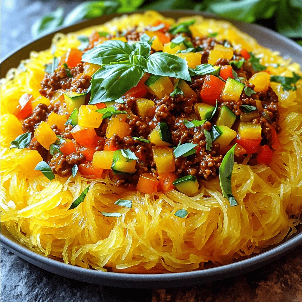 To make Spaghetti Squash Bolognese, gather these items: - 1 medium spaghetti squash - 1 tablespoon olive oil - 1 onion, finely chopped - 2 cloves garlic, minced - 1 carrot, diced - 1 celery stalk, diced - 1 bell pepper (any color), diced - 1 zucchini, diced - 1 (14 oz) can crushed tomatoes - 1 tablespoon tomato paste - 1 teaspoon dried oregano - 1 teaspoon dried basil - Salt and pepper to taste - Fresh basil leaves for garnish For a fresh twist, consider using: - Fresh basil instead of dried - A mix of colorful bell peppers - Seasonal veggies like spinach or mushrooms These fresh ingredients boost flavor and nutrition. They add color and texture too. You might already have these in your kitchen: - Olive oil - Garlic - Canned crushed tomatoes - Tomato paste - Dried herbs like oregano and basil - Salt and pepper These pantry staples make the sauce rich. They create that classic Bolognese taste. First, preheat your oven to 400°F (200°C). Cut the spaghetti squash in half lengthwise. Be careful while cutting! Scoop out the seeds with a spoon. Drizzle a bit of olive oil inside each half. Then, sprinkle with salt and pepper. Place the squash cut side down on a baking sheet. Bake it for 30-40 minutes. You want it soft enough to scrape with a fork. While the squash bakes, heat olive oil in a large skillet over medium heat. Add the chopped onion and sauté until it looks clear, about 3-4 minutes. Next, stir in the minced garlic, diced carrot, celery, and bell pepper. Cook for another 5 minutes. This makes the veggies tender. Then, add the diced zucchini and cook until it gets soft. Pour in the crushed tomatoes and add the tomato paste, oregano, basil, salt, and pepper. Mix well. Lower the heat and let it simmer for 15-20 minutes. Stir it occasionally to blend the flavors. Once the spaghetti squash is done, take it out from the oven. Let it cool for a few minutes. Use a fork to scrape the flesh into spaghetti-like strands. Place these strands on a plate. Top with your Bolognese sauce, and don’t forget to garnish with fresh basil leaves. Enjoy your healthy and delicious meal! To get a rich Bolognese flavor, start with good olive oil. Sauté the onion until it turns clear. This step builds a tasty base. Add garlic next for a nice aroma. Using fresh herbs like basil and oregano makes a big difference. If you want a bit more depth, add a splash of red wine while the sauce simmers. Let it cook slowly for about 20 minutes. This time lets the flavors mix well. Cooking spaghetti squash is simple but needs care. Start by cutting the squash in half. Scoop out the seeds before seasoning. Drizzle olive oil inside and sprinkle salt and pepper. Make sure to place it cut side down on a baking sheet. Bake it at 400°F for 30 to 40 minutes. You know it’s ready when you can scrape the flesh easily with a fork. When serving, use a fork to create the noodle strands. Place the strands on a plate and top with the Bolognese sauce. A few fresh basil leaves on top add color and taste. If you like cheese, sprinkle some grated Parmesan for extra flavor. This dish pairs well with a simple green salad or crusty bread. Enjoy your healthy meal! {{image_2}} You can easily make this dish vegetarian or vegan. Simply skip the meat and use extra veggies. For a vegan twist, swap in vegetable broth for added taste. You can also add lentils or chickpeas for protein. These swaps keep the dish hearty and flavorful. If you want more protein in your meal, add ground turkey or beef. You can also use plant-based proteins like tempeh or lentils. Just brown them in the skillet before adding the vegetables. This way, you keep the rich flavor of Bolognese while boosting nutrition. Feel free to adjust the spices to suit your taste. A pinch of red pepper flakes adds heat. Fresh herbs like thyme or rosemary can deepen the flavors. You can also try adding a splash of red wine for a richer sauce. Experimenting with spices makes each meal unique and exciting. After you enjoy your Spaghetti Squash Bolognese, store any leftovers in an airtight container. This keeps the dish fresh and tasty. You can keep it in the fridge for up to three days. Make sure to let the dish cool down before sealing it. This step helps prevent moisture build-up inside the container. To reheat, you can use a microwave or a stovetop. If using a microwave, place the portion on a plate and cover it with a damp paper towel. Heat for about 1-2 minutes, checking if it’s warm throughout. For stovetop reheating, warm the Bolognese sauce in a pan over low heat until it’s hot. Stir occasionally to avoid burning. If you want to save your Spaghetti Squash Bolognese for later, freezing is a great option. First, let the dish cool completely. Then, pack it in a freezer-safe container. You can also use freezer bags for easy storage. Squeeze out as much air as possible before sealing. This can keep the dish good for about three months. When you're ready to eat, thaw it overnight in the fridge before reheating. Yes, you can! Other squash types like butternut or acorn squash work well. They have a sweet taste that adds flavor. Keep in mind, they may not have the same noodle-like texture. You might need to adjust cooking times based on the squash type. Experimenting can lead to fun new dishes. You will know it's done when the flesh is soft. After baking for 30-40 minutes, poke it with a fork. If it easily scrapes into strands, it is ready. If it feels firm or hard, bake it a little longer. Trust your fork; it is the best test! Spaghetti squash is low in calories but high in nutrients. It is rich in vitamins A and C, which help your body. It also has fiber, which is good for digestion. Plus, it is a great low-carb alternative to regular pasta. Eating it can help you feel full and satisfied. We explored how to make a great Bolognese sauce with spaghetti squash. We covered ingredients, step-by-step cooking, and helpful tips. You also learned about tasty variations and storage methods. Remembe