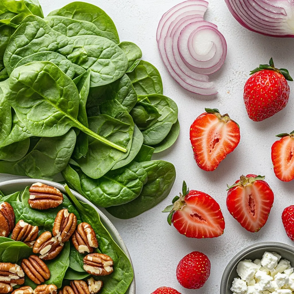 Next, grab a large mixing bowl. Add 4 cups of washed and torn fresh spinach. Then, pile in 2 cups of hulled and sliced strawberries. Toss in 1/2 cup of toasted pecans for crunch. Add 1/4 thinly sliced red onion for a zesty bite. If you like, sprinkle in 1/4 cup of crumbled feta cheese for creaminess.