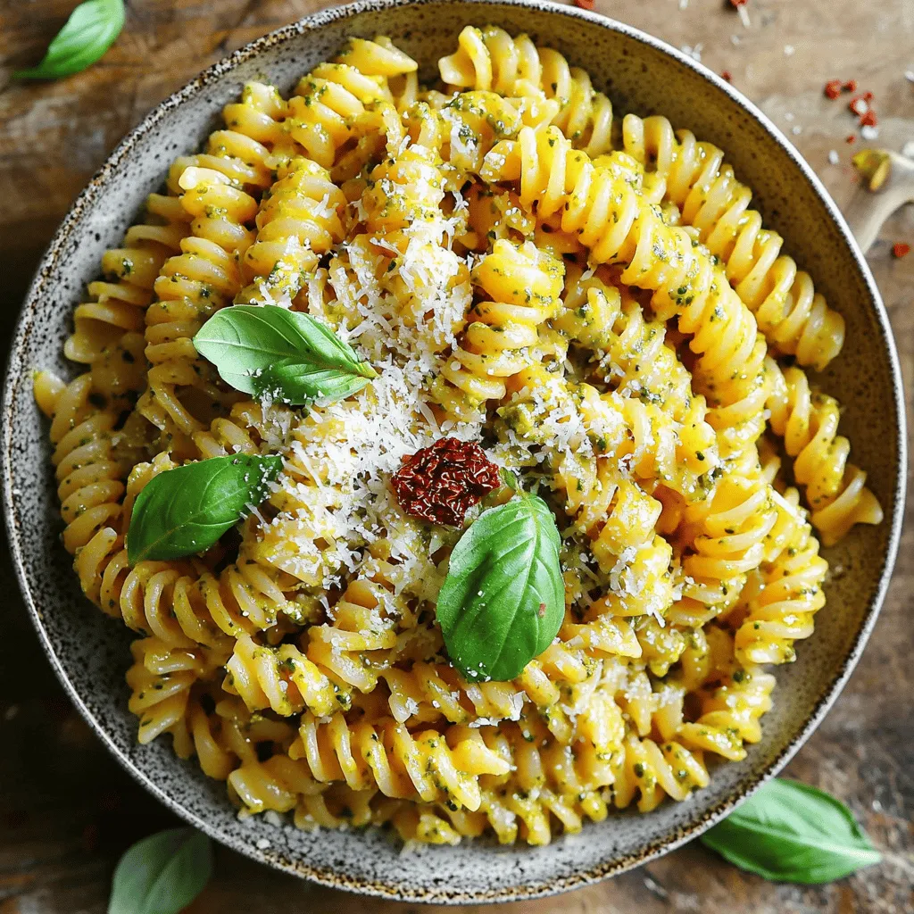 - 2 cups pasta (fusilli or penne) - 1 cup sun-dried tomatoes (packed in oil) - 1 cup fresh basil leaves - 1/4 cup pine nuts or walnuts - 1/2 cup grated Parmesan cheese - 1/4 cup olive oil - Crushed red pepper flakes - Additional Parmesan and fresh basil for garnishing To make Sun-Dried Tomato Pesto Pasta, you need simple yet tasty ingredients. First, choose your pasta. Fusilli or penne works best. These shapes hold the sauce well. Next, grab sun-dried tomatoes. They add a rich, tangy flavor. Fresh basil gives a nice, herby taste. Pine nuts or walnuts add crunch and depth. Grated Parmesan cheese makes everything creamy and savory. Olive oil helps blend the pesto and adds richness. You can add crushed red pepper for a spicy kick. Finally, use more Parmesan and basil for a beautiful garnish. These ingredients come together to make a quick and delicious meal that is perfect for any day of the week. Start by boiling salted water in a large pot. The salt adds flavor to the pasta. Once the water boils, add 2 cups of fusilli or penne pasta. Cook the pasta according to the package instructions until it is al dente. This means it should be firm to the bite, not mushy. After cooking, drain the pasta but save about 1/2 cup of the pasta water for later. In a food processor, combine the main ingredients for the pesto. You will need 1 cup of sun-dried tomatoes, 1 cup of fresh basil leaves, 1/4 cup of pine nuts or walnuts, 1/2 cup of grated Parmesan cheese, and 2 cloves of minced garlic. Pulse the mixture until it is coarsely blended. Next, drizzle in 1/4 cup of olive oil while the food processor runs. This makes the pesto creamy. If your pesto is too thick, add the reserved pasta water a tablespoon at a time. Mix until you reach your desired consistency. Season with salt and pepper to taste. If you like some heat, add crushed red pepper flakes. In the pot you used for the pasta, add the cooked pasta. Pour the sun-dried tomato pesto over the pasta. Toss everything together until the pasta is fully coated in the pesto. To serve, transfer the pasta to plates. You can garnish it with more grated Parmesan and fresh basil leaves for an extra touch. Enjoy your quick and tasty meal! How to determine pasta doneness To check if your pasta is done, taste a piece. You want it to be firm but not hard. This is called al dente, meaning "to the tooth." If it feels soft, it might be overcooked. Importance of reserving pasta water Before draining your pasta, save some of the cooking water. This water is starchy and helps the pesto stick to the pasta. It also makes the sauce creamier. Just scoop out about half a cup before you drain. Storing pesto in the refrigerator If you have leftover pesto, store it in a clean jar. Make sure to cover the top with a thin layer of olive oil. This keeps it fresh and prevents browning. It will last about a week in the fridge. Freezing leftover pesto For longer storage, freeze your pesto. You can use ice cube trays for easy portions. Once frozen, transfer the cubes to a freezer bag. It stays good for up to six months. Just thaw it when you’re ready to use it! {{image_2}} You can switch nuts in the pesto. Pine nuts are great, but walnuts work well too. They add a different flavor that many enjoy. Try cashews for a creamier texture. You can also change the cheese. Parmesan is classic, but feta adds a tangy twist. Goat cheese makes it rich and smooth. For a nutty taste, use pecorino. To make a vegan version of Sun-Dried Tomato Pesto Pasta, skip the cheese. You can replace it with nutritional yeast. This gives a cheesy taste without dairy. If you need gluten-free options, use gluten-free pasta. Many brands have great textures. Rice or chickpea pasta can be fun choices. They hold the sauce well, making every bite tasty. To keep your Sun-Dried Tomato Pesto Pasta fresh, store it in an airtight container. This helps the pasta stay moist and tasty. Place it in the refrigerator right after it cools. It is best to eat it within three days. After that, the flavor may change. If you want to keep it longer, consider freezing it. The pasta can last up to three months in the freezer. Just remember to thaw it in the fridge before reheating. You can reheat your pasta in two ways: the microwave or the stovetop. If you choose the microwave, place the pasta in a bowl. Add a splash of water to keep it moist. Cover it with a lid or plastic wrap and heat for about one to two minutes. Check to see if it is warm enough. For stovetop reheating, put the pasta in a pan over low heat. Add a little olive oil or water to help with sticking. Stir it gently until warmed through. This method helps to keep the pasta's texture and flavor. Remember, don’t overheat it, or the pasta may become mushy. Enjoy your tasty meal! To make Sun-Dried Tomato Pesto, gather these ingredients: - 1 cup sun-dried tomatoes (packed in oil) - 1 cup fresh basil leaves - 1/4 cup pine nuts (or walnuts) - 1/2 cup grated Parmesan cheese - 2 cloves garlic, minced - 1/4 cup olive oil - Salt and pepper to taste First, combine the sun-dried tomatoes, basil, nuts, cheese, and garlic in a food processor. Pulse them until they blend well but remain coarse. Next, slowly add the olive oil while the processor runs. If the pesto is thick, add a bit of reserved pasta water until it is creamy. Season with salt and pepper, adjusting to your taste. Yes, you can use fresh tomatoes, but the flavor will change. Fresh tomatoes have more water and a milder taste. You should roast or dry them first for a richer flavor. For this recipe, sun-dried tomatoes work best. They give a strong, sweet taste that fresh tomatoes lack. Sun-Dried Tomato Pesto Pasta pairs well with many dishes. Here are a few ideas: - Grilled chicken or fish for added protein - A fresh green salad to balance the flavors - Garlic bread for a crunchy side - Roasted vegetables for extra nutrition These options will create a delicious meal that is satisfying and fun! This blog post covered making Sun-Dri