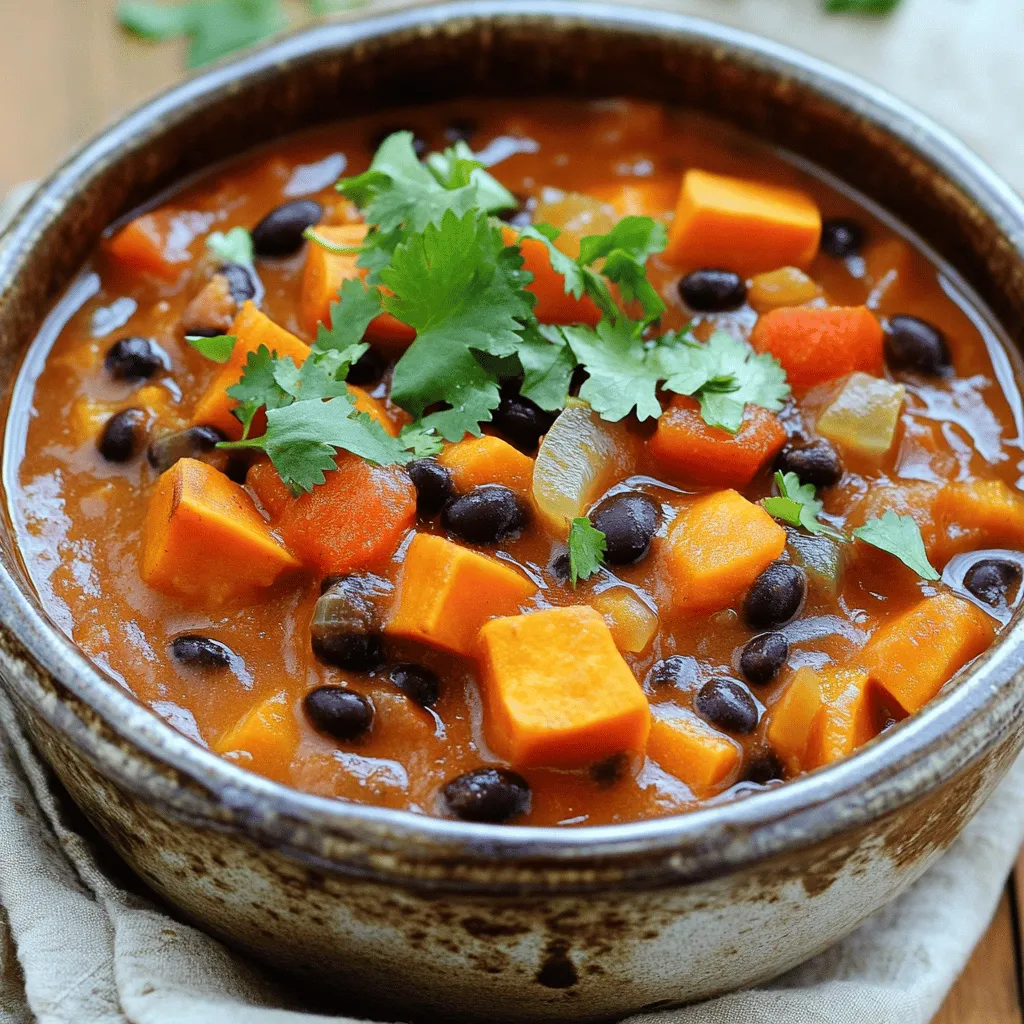 - 2 large sweet potatoes, peeled and diced - 1 can (15 oz) black beans, rinsed and drained - 1 can (14 oz) diced tomatoes with green chilies Sweet potatoes bring a sweet taste and soft texture. They add nutrients like fiber and vitamins. Black beans offer protein and heartiness, making the stew filling. Diced tomatoes create a rich base and add acidity. Together, these three ingredients make a delightful foundation for the stew. - 1 yellow onion, diced - 3 cloves garlic, minced - 1 red bell pepper, diced - 1 teaspoon ground cumin - 1 teaspoon smoked paprika - ½ teaspoon chili powder - Salt and pepper to taste Onion and garlic are key for flavor. They bring a savory base to the dish. The spices add warmth and depth. Cumin gives a nutty aroma, while smoked paprika adds a hint of smoke. Salt and pepper enhance all the flavors, making every bite enjoyable. - 1 cup vegetable broth - 2 tablespoons olive oil - Fresh cilantro for garnish Vegetable broth adds moisture and richness. It helps the stew cook slowly and evenly. Olive oil adds healthy fats and helps sauté the vegetables. Fresh cilantro brightens the dish, adding color and freshness. With these ingredients, your sweet potato black bean stew will be a hit! Start by heating 2 tablespoons of olive oil in a skillet over medium heat. Add the diced yellow onion and red bell pepper. Sauté these until soft, about 3 to 4 minutes. The colors and smells will fill your kitchen. Next, add 3 minced garlic cloves. Sauté for just 1 more minute. This will bring out the garlic's flavor. Now, grab your slow cooker. Layer in 2 large diced sweet potatoes and 1 can of black beans, rinsed and drained. Then, pour in 1 can of diced tomatoes with green chilies. Add 1 cup of vegetable broth, too. Sprinkle in 1 teaspoon of ground cumin, 1 teaspoon of smoked paprika, and ½ teaspoon of chili powder. Season with salt and pepper to your taste. Mix everything well. This helps the flavors blend. Cover the slow cooker. You can set it on low for 6 to 8 hours or high for 3 to 4 hours. The sweet potatoes should be tender when done. To check for doneness, poke a sweet potato piece with a fork. If it breaks apart easily, your stew is ready. Enjoy the warm, hearty smell as it cooks! To boost the flavor of your stew, try adding some extra spices. A pinch of cayenne pepper can add heat. You can also consider adding ground coriander for a citrusy note. Each spice brings its own twist. Using fresh herbs can elevate your dish. Cilantro adds a bright touch when added at the end. Fresh thyme or oregano can also enhance the stew’s aroma. Just chop them finely and stir them in before serving. To keep sweet potatoes firm, cut them into even pieces. This helps them cook at the same rate. If they are too small, they may turn mushy. If your stew turns out too watery, you can fix it. Let it cook uncovered for a bit to evaporate some liquid. You can also mash a few sweet potato pieces. This thickens the stew naturally and adds creaminess. For the best results, set your slow cooker to low. This allows the flavors to deepen as they cook. Low settings work for 6-8 hours, while high settings need 3-4 hours. Keeping the lid on during cooking is key. It helps maintain a consistent temperature. Avoid opening the lid too often, as this lets heat escape. {{image_2}} You can easily change the beans in this stew. Try kidney beans or pinto beans instead of black beans. Each bean brings a unique taste and texture to the dish. You might also consider adding legumes like lentils for an extra twist. Adding other vegetables can brighten the stew. Carrots add sweetness, while zucchini gives a soft texture. You can even throw in some corn for a pop of color and crunch. Feel free to mix and match any veggies you like! If you want more heat, add fresh peppers. Jalapeños or serranos will spice things up. Just remember to remove the seeds for less heat. You can also use red pepper flakes for a quick kick. If you prefer a milder flavor, skip the chili powder. You can also reduce the amount of smoked paprika. Adding a bit of honey can balance the spice while keeping it delicious. This stew is naturally vegan and gluten-free. All the ingredients are plant-based, making it a great choice for everyone. You can ensure it remains gluten-free by using certified gluten-free broth. For high-protein options, consider adding quinoa or tofu. These will boost the protein content without changing the flavor much. This way, you can enjoy a filling meal that meets your dietary needs. To store your sweet potato black bean stew, use airtight containers. Glass or plastic containers work well. Make sure they are completely cool before sealing. The stew keeps fresh in the fridge for about 4 to 5 days. To freeze the stew, let it cool down first. Then, pour it into freezer-safe bags or containers. Remove as much air as possible to prevent freezer burn. The stew can last in the freezer for up to 3 months. When you're ready to eat it, thaw it overnight in the fridge. Reheat on the stove over low heat or in the microwave until hot. You can create fun dishes with leftovers. Consider making burritos or tacos. Just fill tortillas with the stew and add cheese or avocado. You can also turn it into a dip. Serve it with tortilla chips for a tasty snack. If you have extra stew ingredients, mix them into rice or quinoa for a healthy bowl. You can easily make this stew vegan by swapping out a few ingredients. First, make sure to use vegetable broth instead of any meat broth. The black beans are already vegan. You don’t need to worry about the diced tomatoes either; they are vegan-friendly. If you want to add any toppings like sour cream or cheese, use vegan alternatives. This way, you keep all the great flavors while making it plant-based. Yes, you can use fresh beans! If you choose dry black beans, soak them overnight in water. This helps soften them. After soaking, drain and rinse the beans. Cook them in water until they are tender, which
