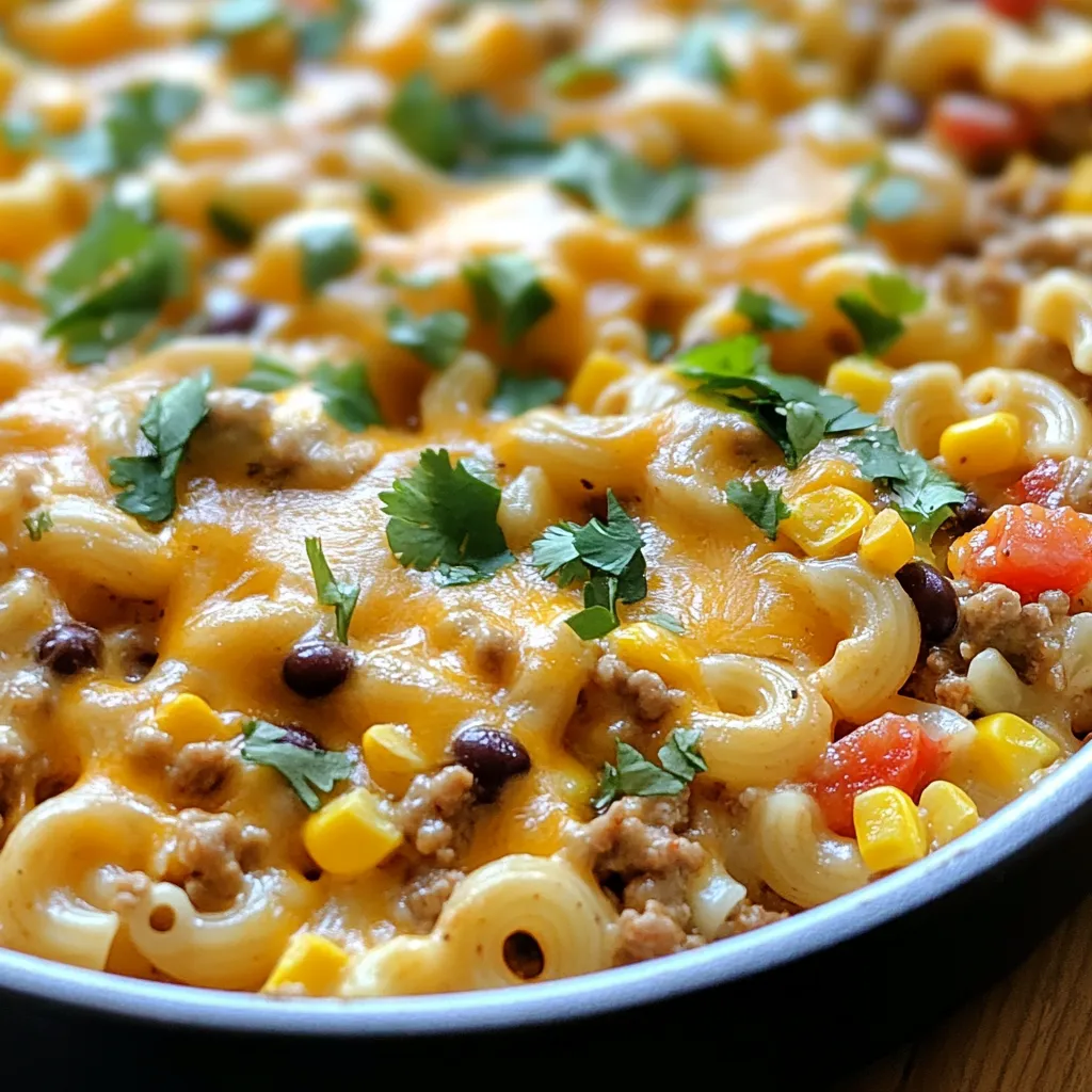 A delicious and easy one-pan meal combining tacos and macaroni.
