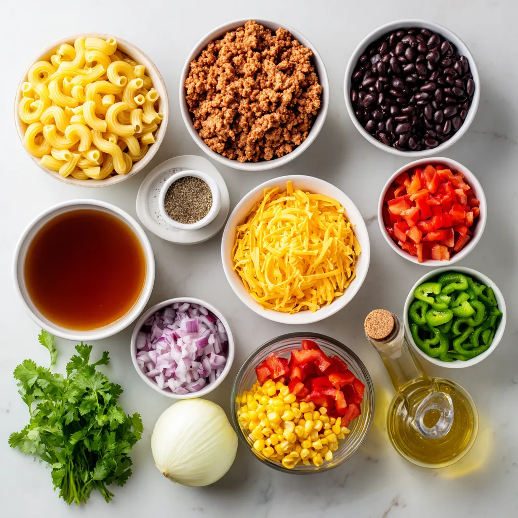 Taco Mac Skillet starts with hearty main ingredients. You can use ground turkey or beef as your protein. I prefer ground turkey for a lighter touch. Elbow macaroni gives a nice bite, making it a cozy dish. Black beans add protein and fiber, while diced tomatoes with green chilies bring zest and color.