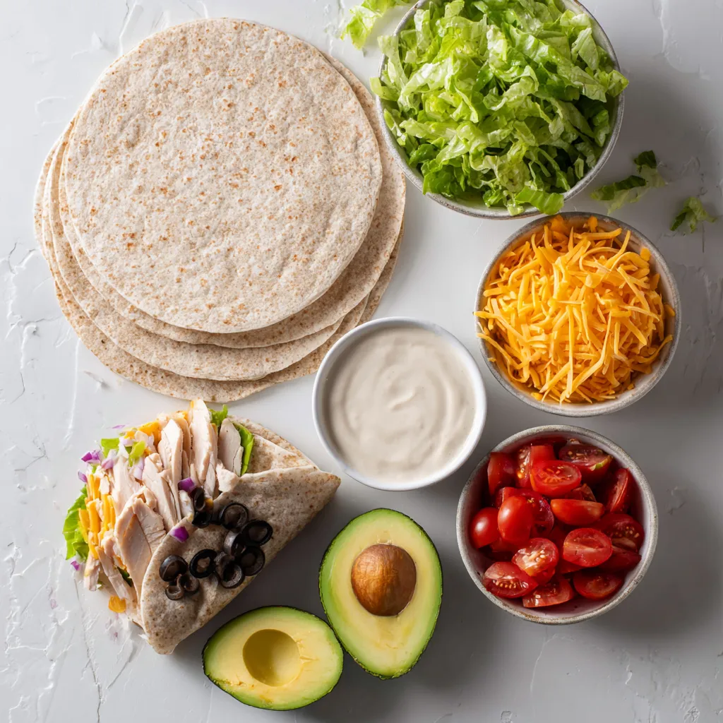 Gather these ingredients before you start. Whole wheat tortillas provide a healthy base. Sliced turkey breast packs in protein. Ranch dressing adds great flavor. Fresh vegetables like lettuce and tomatoes make the wraps crunchy. Cheese gives it a creamy touch. You can add black olives and avocado for extra taste. Don’t forget salt and pepper to enhance the flavors.