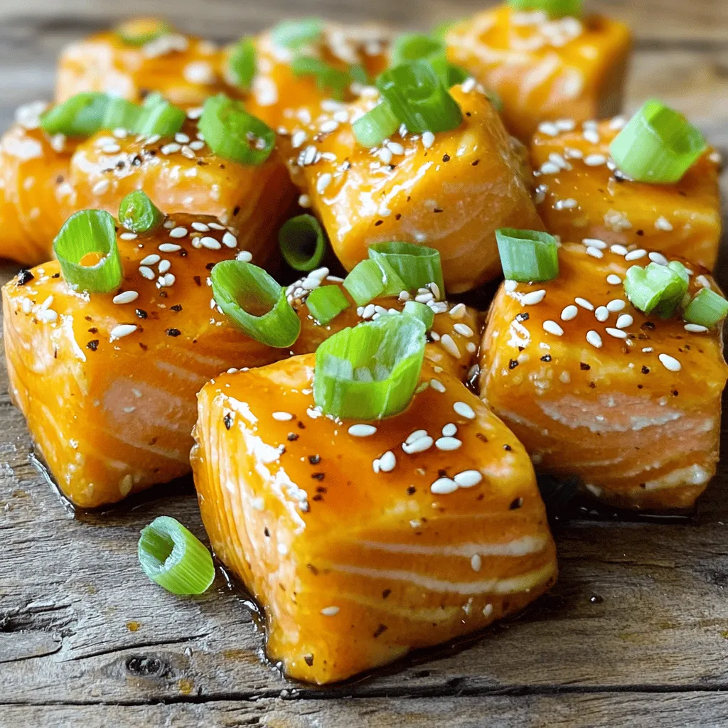 These salmon bites pair well with many sides. Serve them with steamed rice or quinoa for a filling meal. You can also offer a fresh salad to balance the richness of the salmon. For sauces, a drizzle of spicy mayo or extra teriyaki sauce enhances the flavor. Don’t forget to garnish with sesame seeds and green onions for a beautiful presentation!