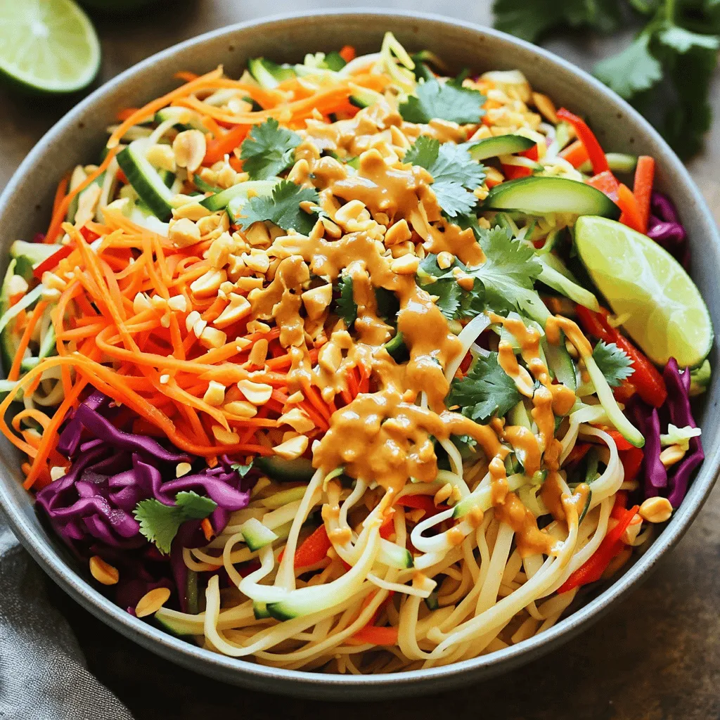 Now it’s time to assemble the salad. In a large mixing bowl, combine the cooked rice noodles, shredded carrots, sliced red bell pepper, julienned cucumber, thinly sliced red cabbage, chopped cilantro, and sliced green onions. Pour the peanut sauce over the noodle mixture. Toss everything gently until well coated. This ensures every bite is full of flavor. Let the salad sit for about 10 minutes. This helps the flavors blend well. Just before serving, sprinkle the chopped roasted peanuts on top for a crunchy finish.