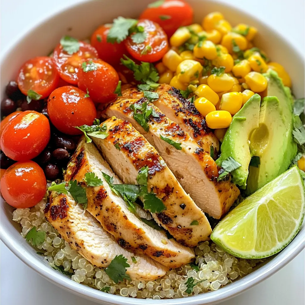For each serving, I start with a base of fluffy quinoa. Then, I slice the rested chicken and arrange it on top. I add cherry tomatoes, black beans, corn, and sliced avocado. For a lovely touch, I drizzle some lime juice over the bowl and sprinkle fresh cilantro on top. This not only adds flavor but also makes the dish look beautiful.